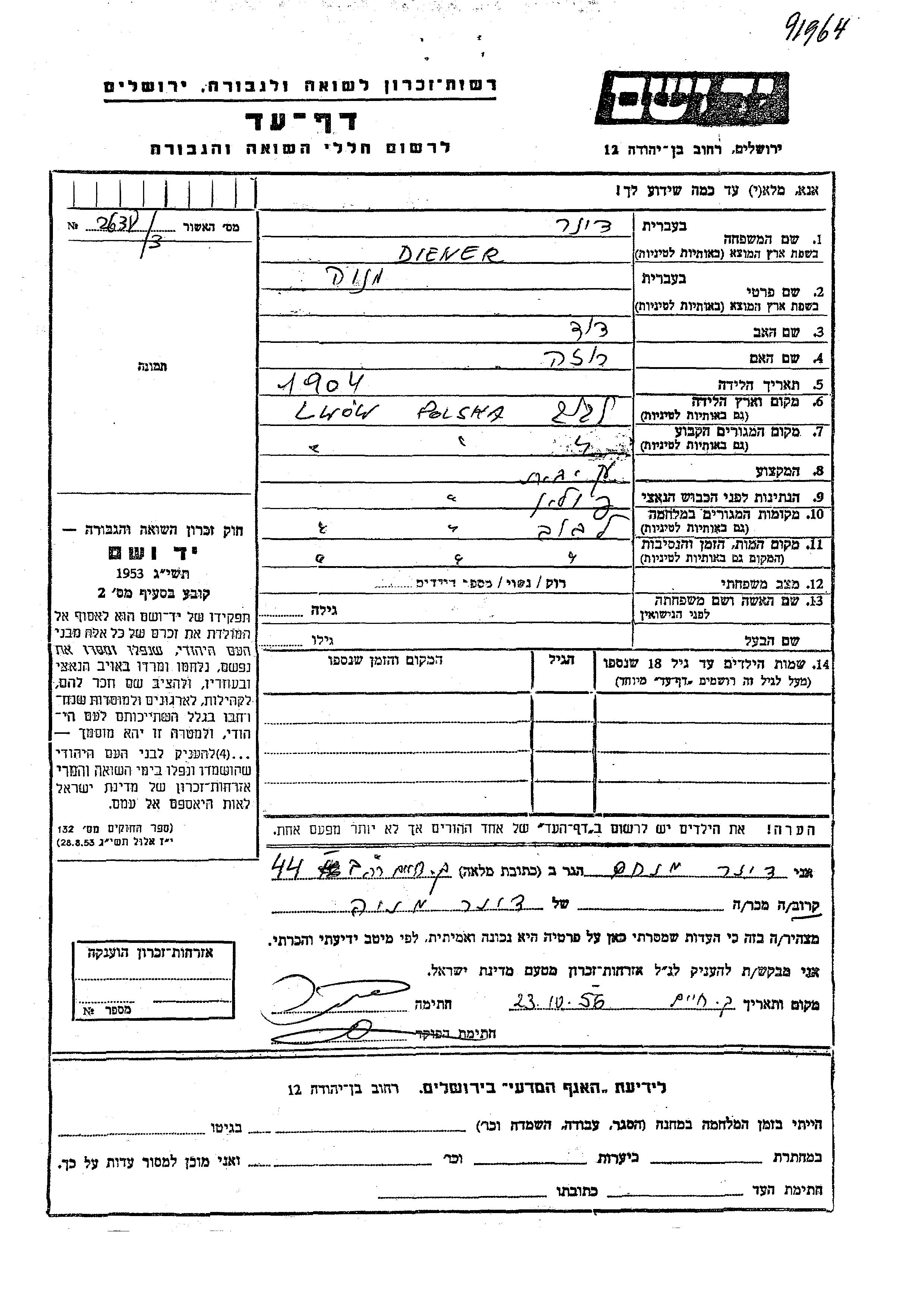 Mania Diener wurde im Jahr 1904 in Lwow, Polen geboren. Sie war die Tochter von David und Roza. Sie war Hausfrau. Vor dem Zweiten Weltkrieg lebte sie in Lwow, Polen. Während des Krieges war sie in Lwow, Polen.