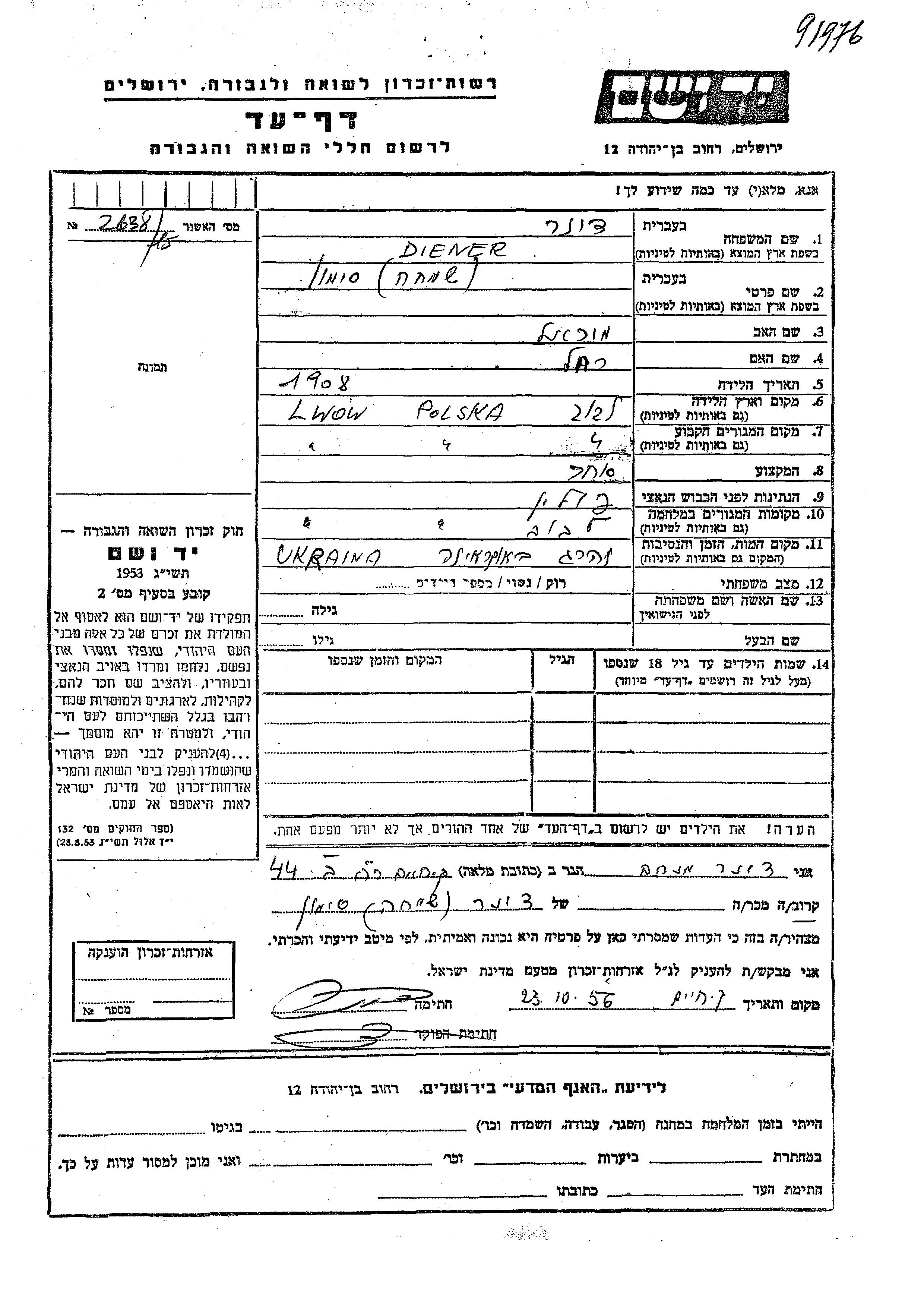 Simkha Simon Diener wurde im Jahr 1908 in Lwow, Polen geboren. Er war der Sohn von Mikhael und Rakhel. Er war Kaufmann/-frau. Vor dem Zweiten Weltkrieg lebte er in Lwow, Polen. Während des Krieges war er in Lwow, Polen.