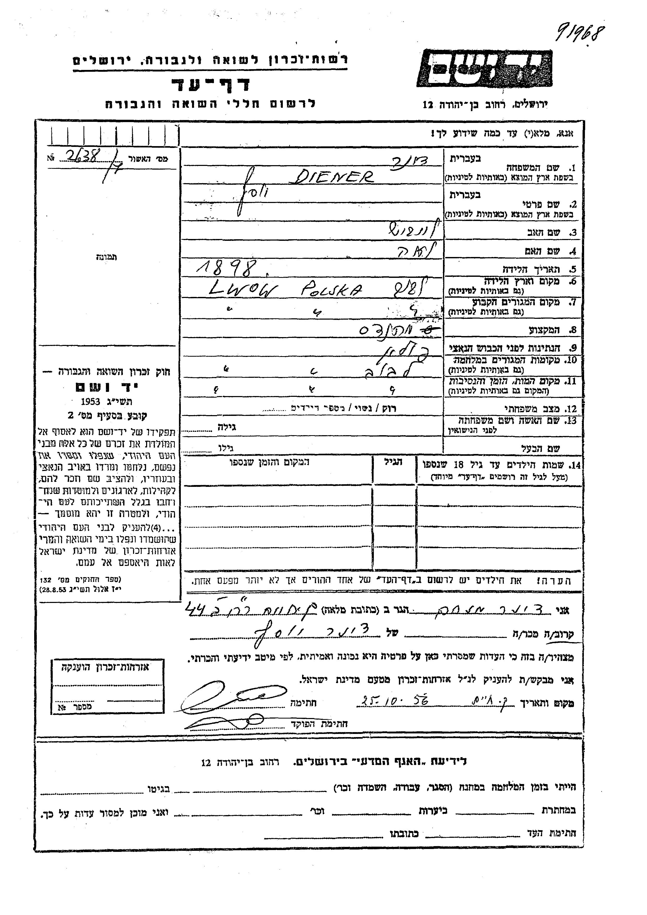 Yosef Diener wurde im Jahr 1898 in Lwow, Polen geboren. Er war der Sohn von Leibish und Lea. Er war Ingenieur. Vor dem Zweiten Weltkrieg lebte er in Lwow, Polen. Während des Krieges war er in Lwow, Polen.