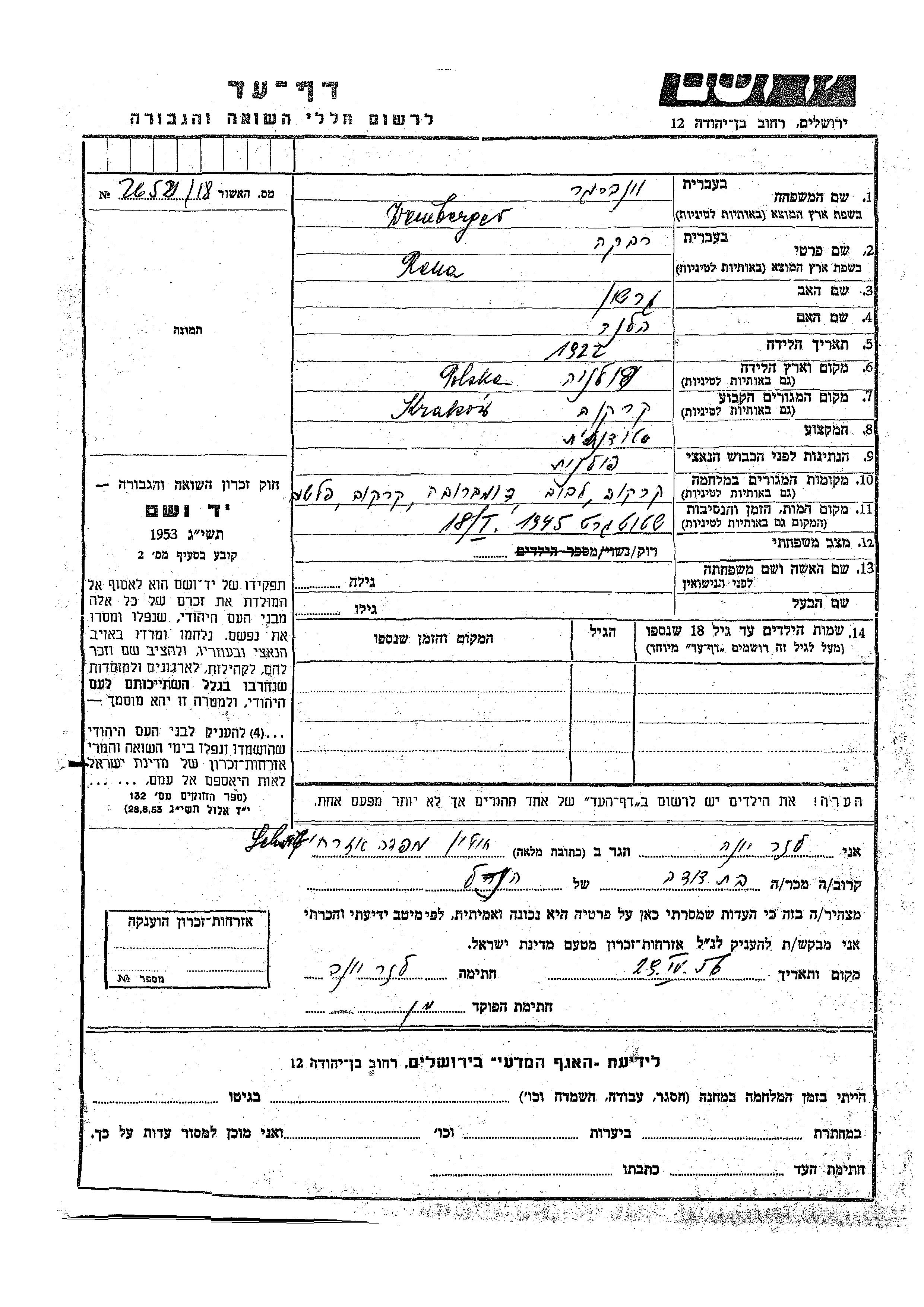 Riva Weinberger wurde im Jahr 1922 in Polen geboren. Sie war die Tochter von Gershon und Helena. Sie war Student und Ledig. Vor dem Zweiten Weltkrieg lebte sie in Krakow, Polen. Während des Krieges war sie in Krakow, Polen.