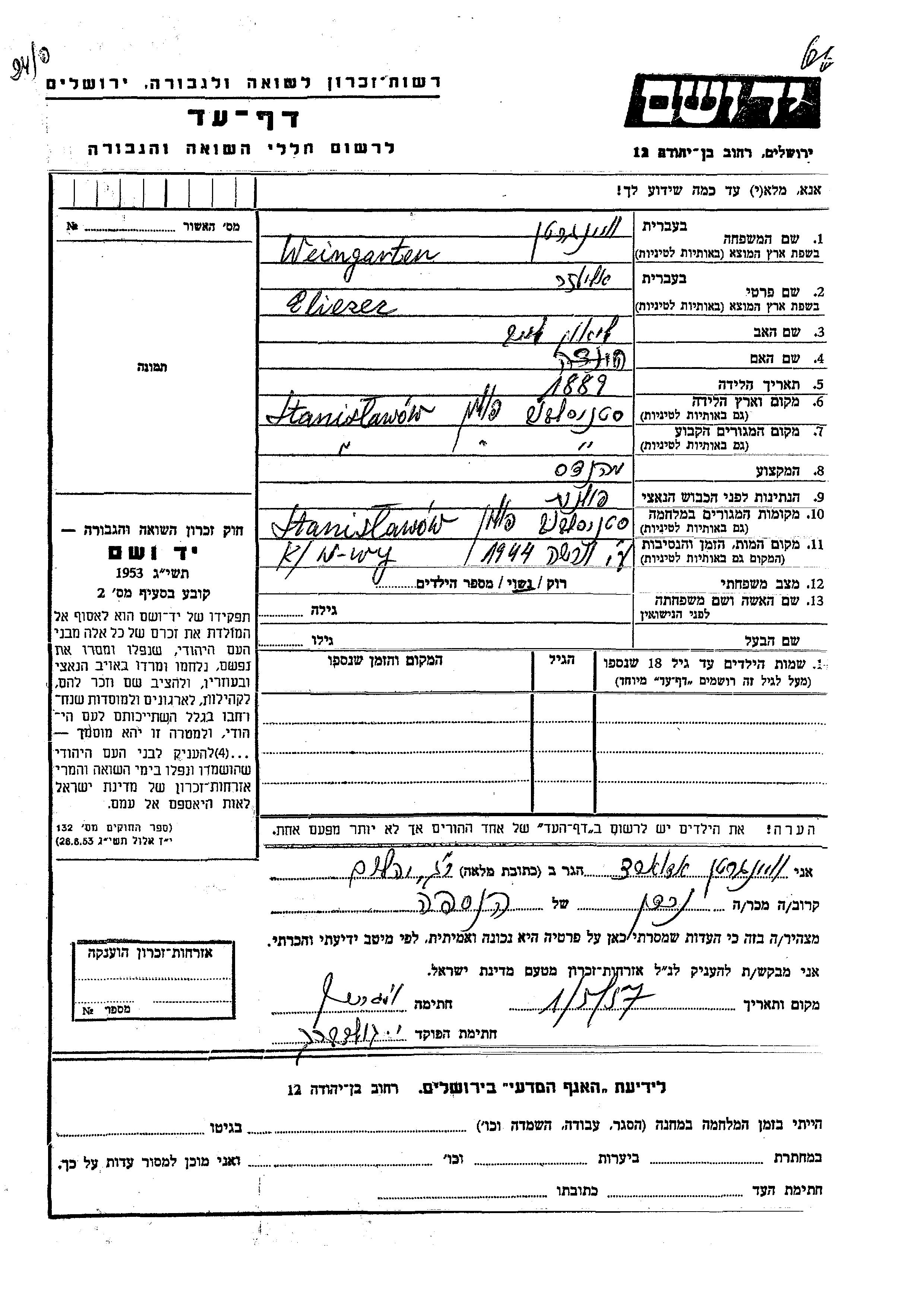 Eliezer Weingarten wurde im Jahr 1889 in Stanislawow, Polen geboren. Er war der Sohn von Lion Leib und Hinda. Er war Ingenieur und Verheiratet. Vor dem Zweiten Weltkrieg lebte er in Stanislawow, Polen. Während des Krieges war er in Stanislawow, Polen.