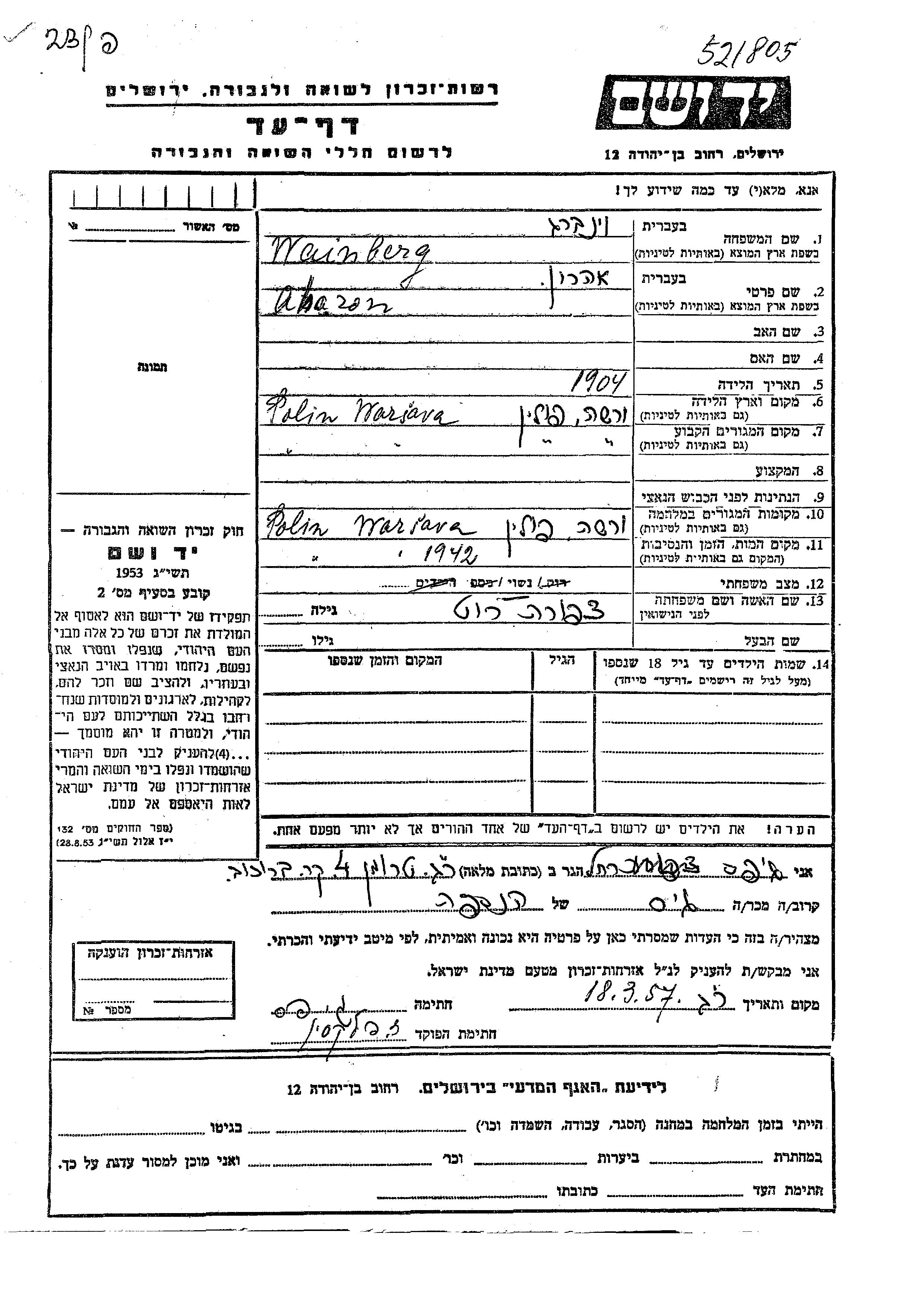 Aharon wurde in der Schoah ermordet. Todesort: Warsaw, Polen im Jahr 1942.