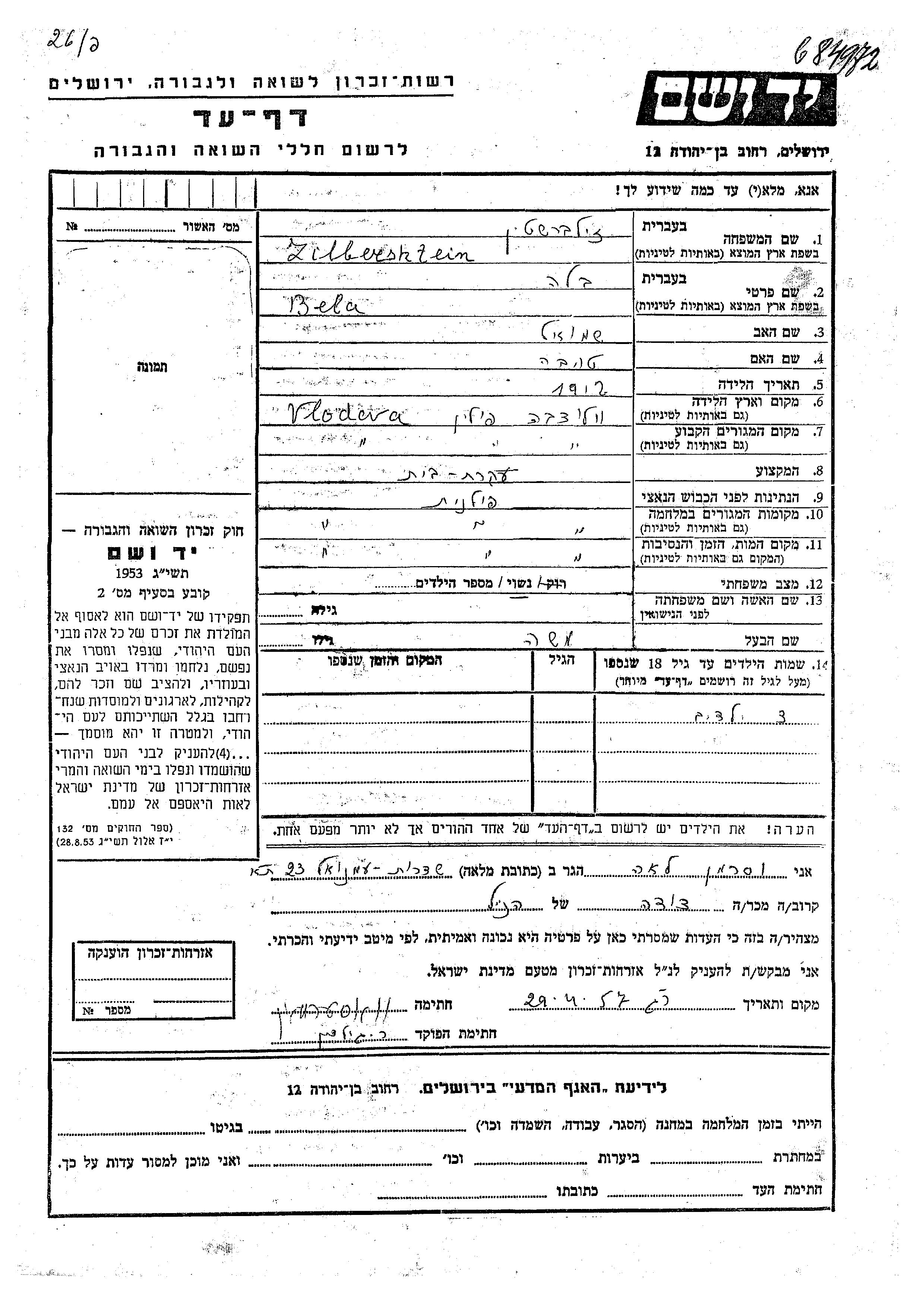 Zilbershtein Bela 1912 Wlodawa, Polen Gedenkblatt