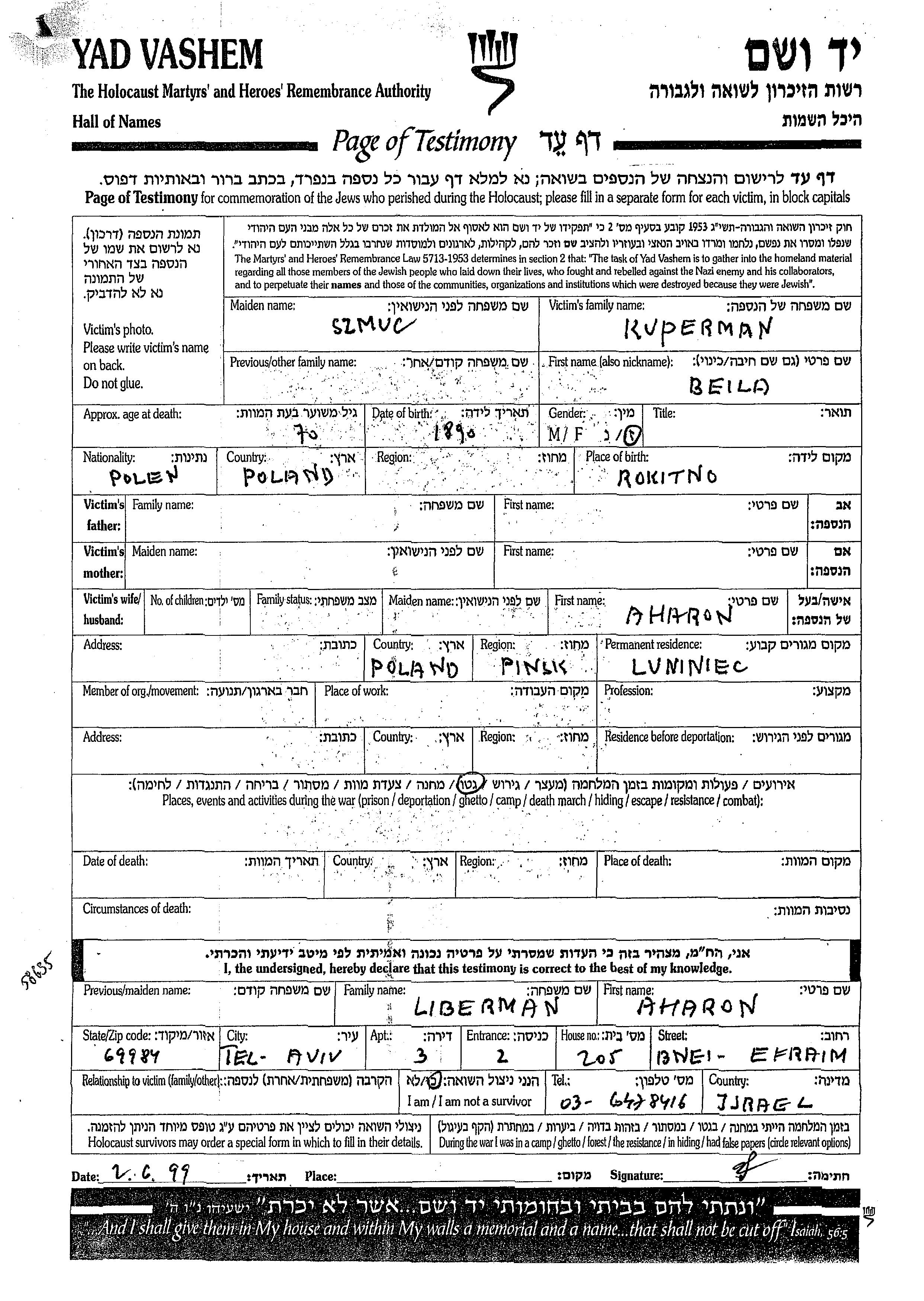 Beila Kuperman, geb. Szmuc wurde im Jahr 1890 in Rokitno, Polen geboren. Vor dem Zweiten Weltkrieg lebte sie in Luniniec, Polen.