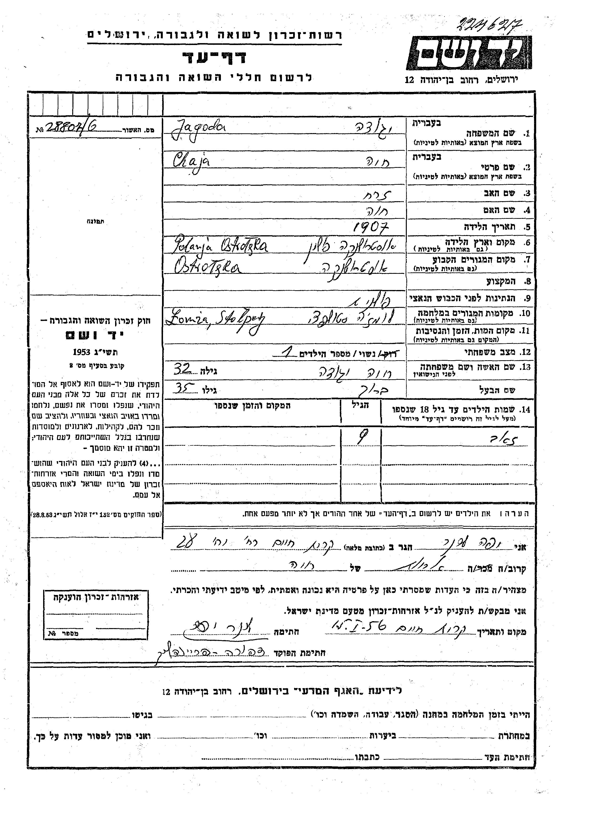 Chaja Jagoda wurde im Jahr 1907 in Ostroleka, Polen geboren. Sie war die Tochter von Zerakh und Khava. Sie war mit Barukh Verheiratet. Vor dem Zweiten Weltkrieg lebte sie in Ostroleka, Polen. Während des Krieges war sie in Łomża, Polen.