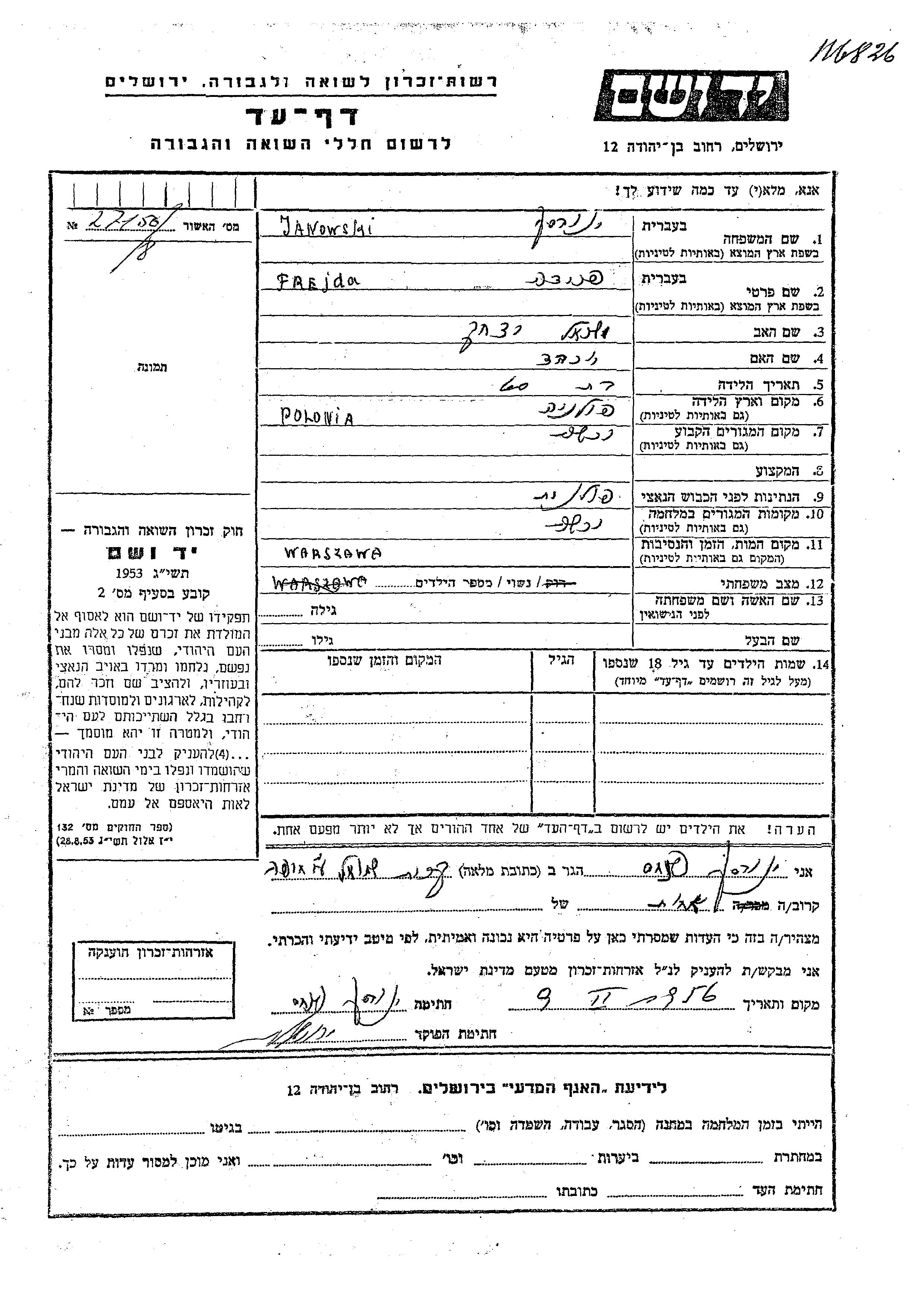 Frejda Frida Janowski wurde in Polen geboren. Sie war die Tochter von Yisrael Yitzkhak und Yokheved. Sie war Verheiratet. Vor dem Zweiten Weltkrieg lebte sie in Warsaw, Polen. Während des Krieges war sie in Warsaw, Polen.