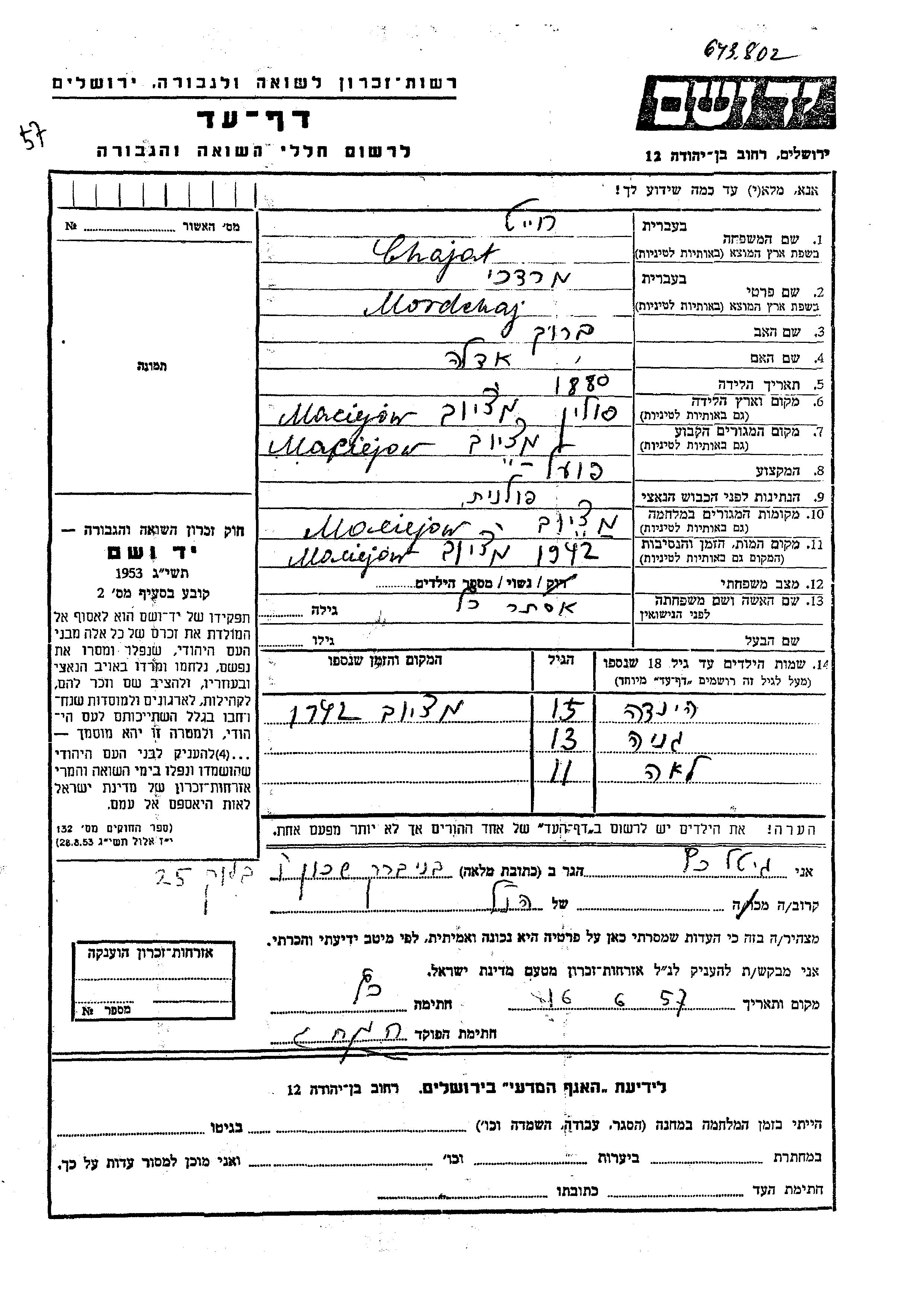 Mordchaj wurde in der Schoah ermordet. Todesort: Maciejow, Polen im Jahr 1942.