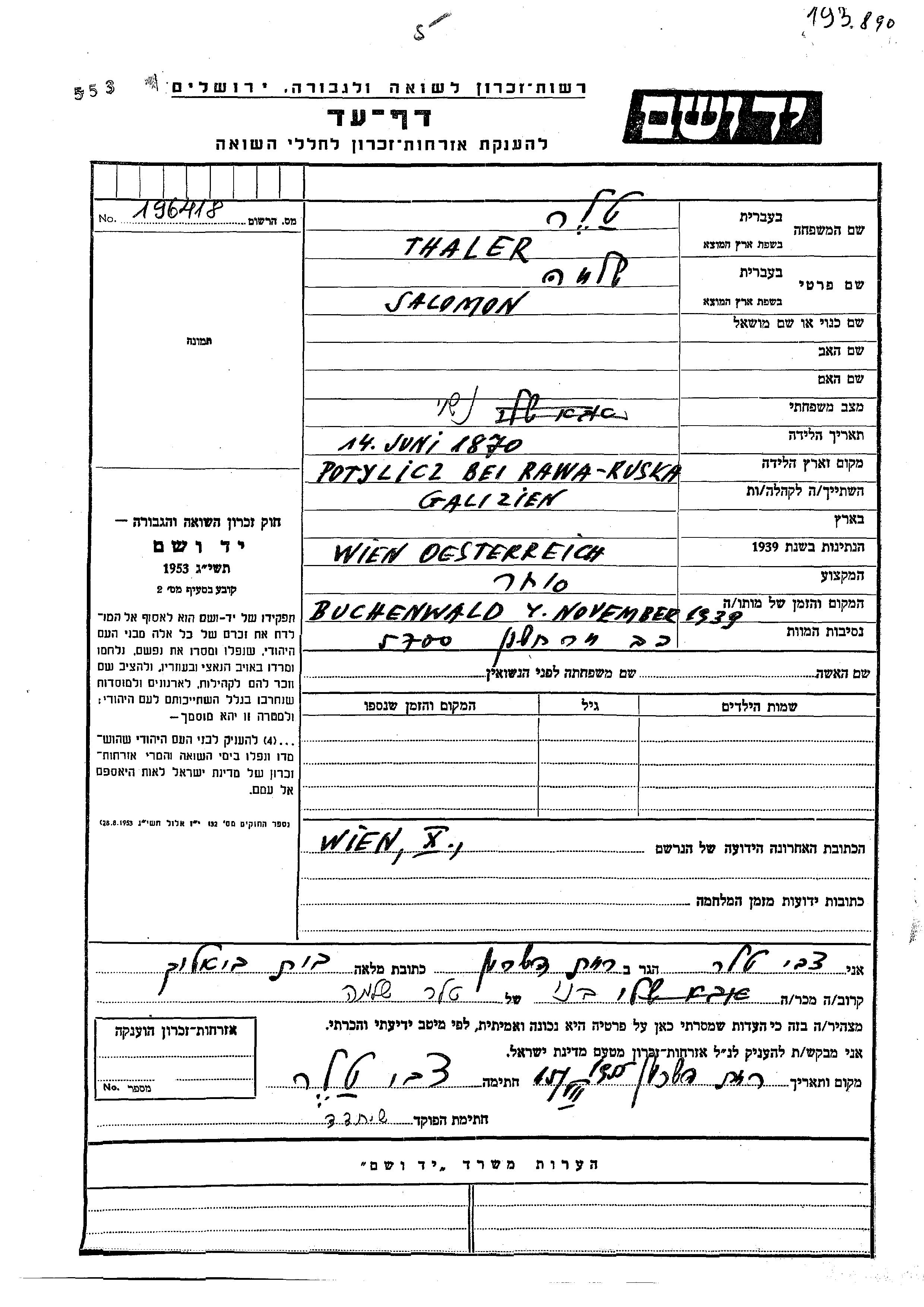 Salomon Thaler wurde im Jahr 1870 in Potylicz, Polen geboren. Er war Kaufmann/-frau.