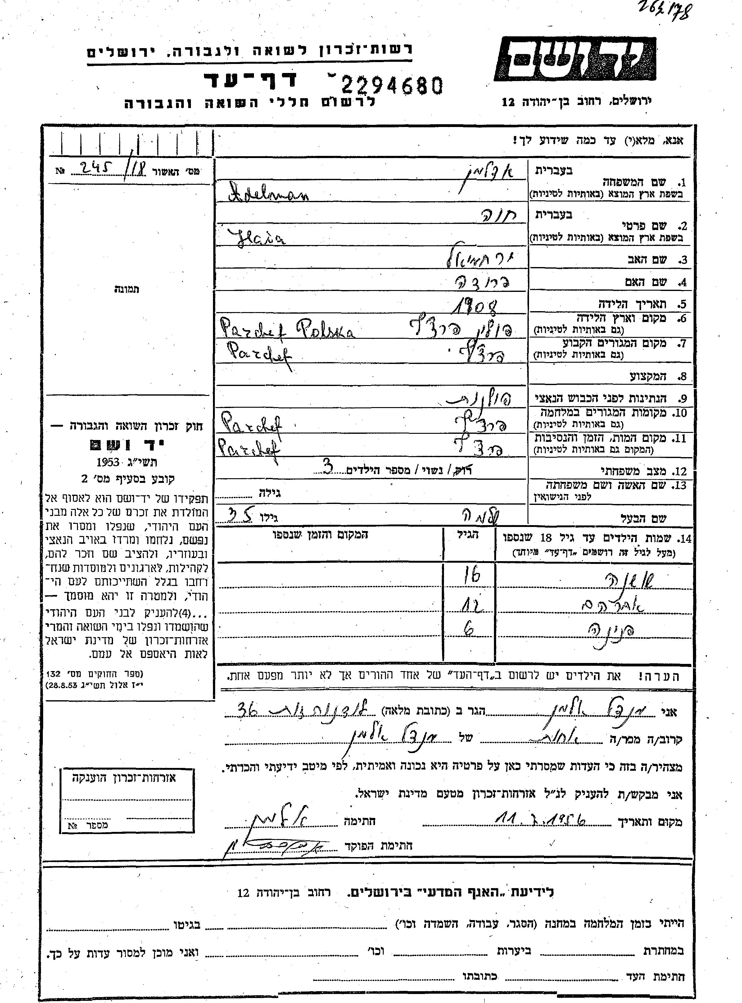 Haia Adelman wurde im Jahr 1908 in Parczew, Polen geboren. Sie war die Tochter von Yerakhmiel und Frida. Sie war mit Szlomo Verheiratet. Vor dem Zweiten Weltkrieg lebte sie in Parczew, Polen. Während des Krieges war sie in Parczew, Polen.