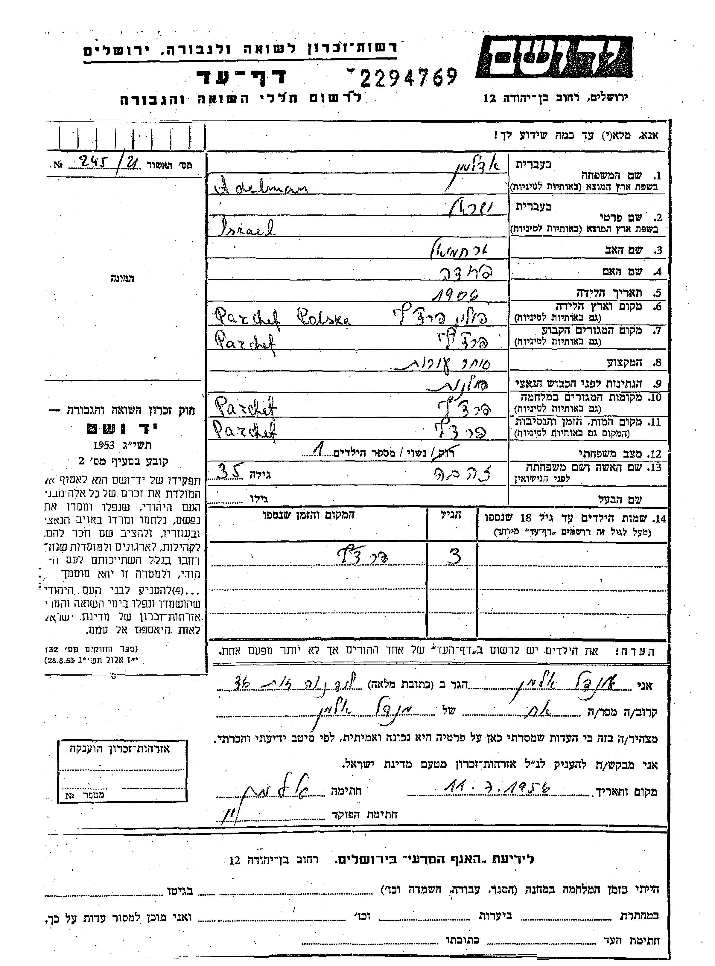 Israel Adelman wurde im Jahr 1906 in Parczew, Polen geboren. Er war der Sohn von Yerakhmiel und Frida. Er war Kaufmann/-frau und mit Zaava Verheiratet. Vor dem Zweiten Weltkrieg lebte er in Parczew, Polen. Während des Krieges war er in Parczew, Polen.