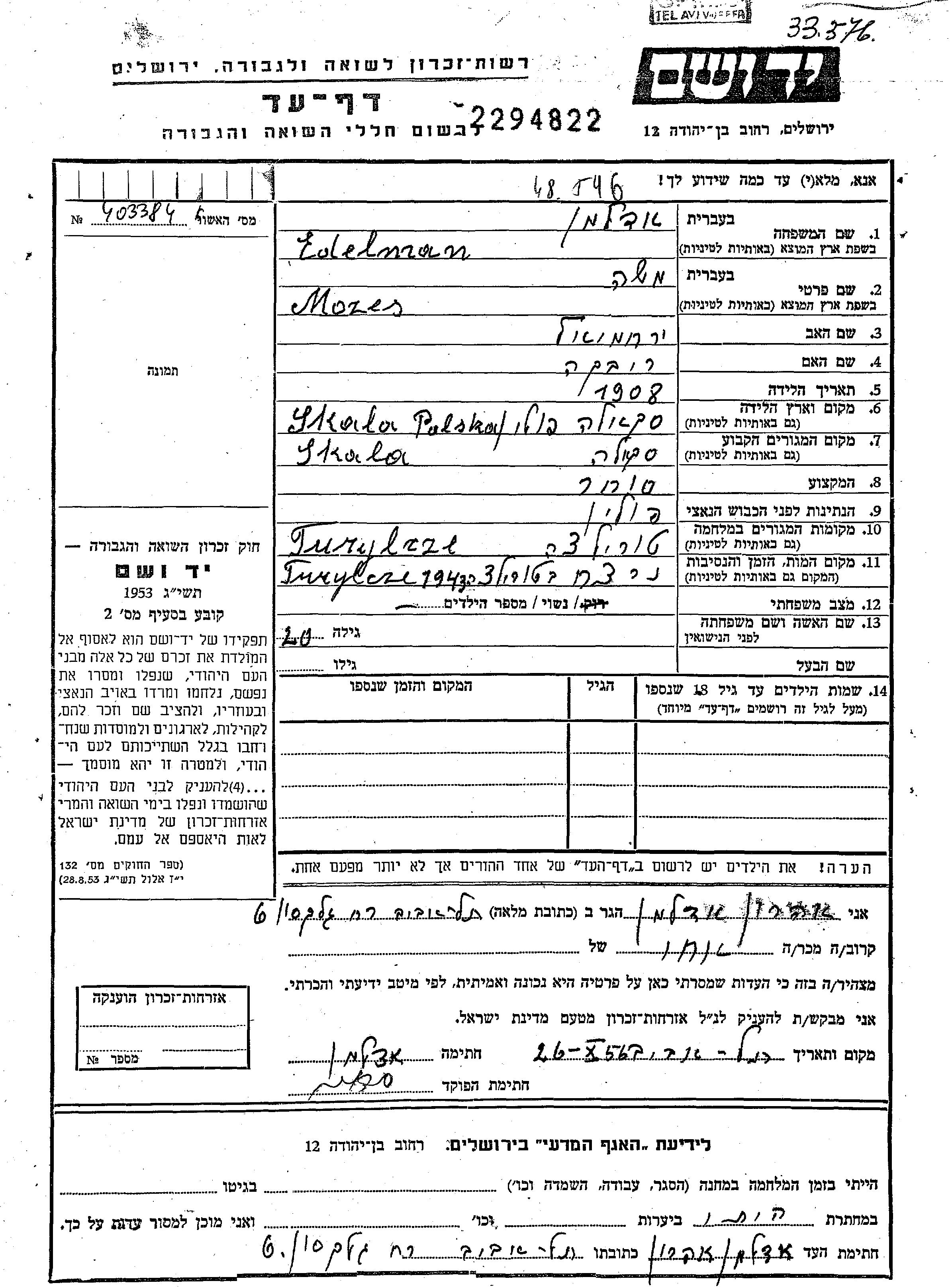 Mosec Edelman wurde im Jahr 1908 in Skala, Polen geboren. Er war der Sohn von Yerakhmiel und Rivka. Er war Kaufmann/-frau und Verheiratet. Vor dem Zweiten Weltkrieg lebte er in Skala, Polen. Während des Krieges war er in Turylcze, Polen.