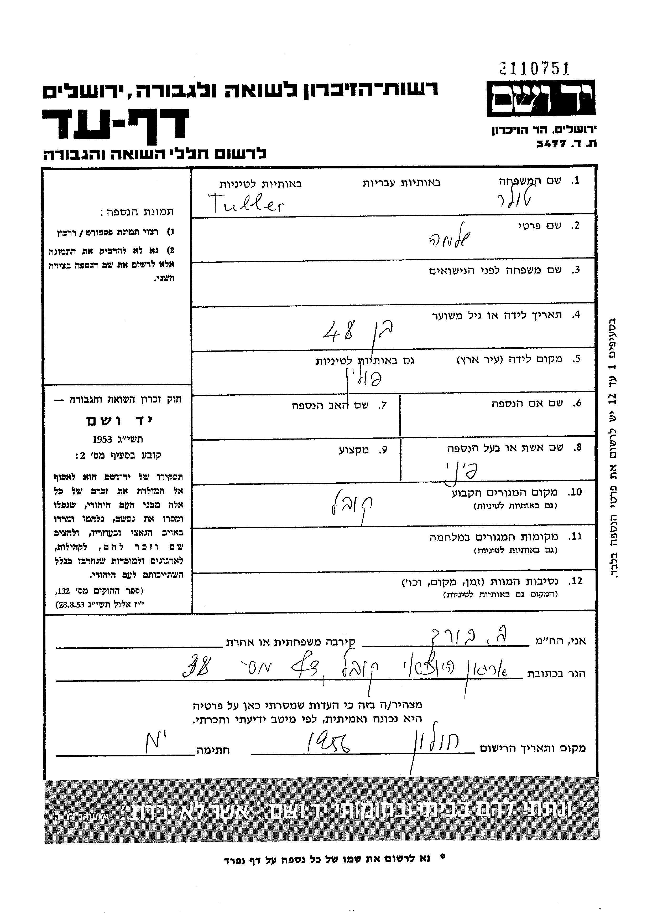 Shlomo Tuller wurde in Polen geboren. Er war mit Fani Verheiratet. Vor dem Zweiten Weltkrieg lebte er in Kowel, Polen.