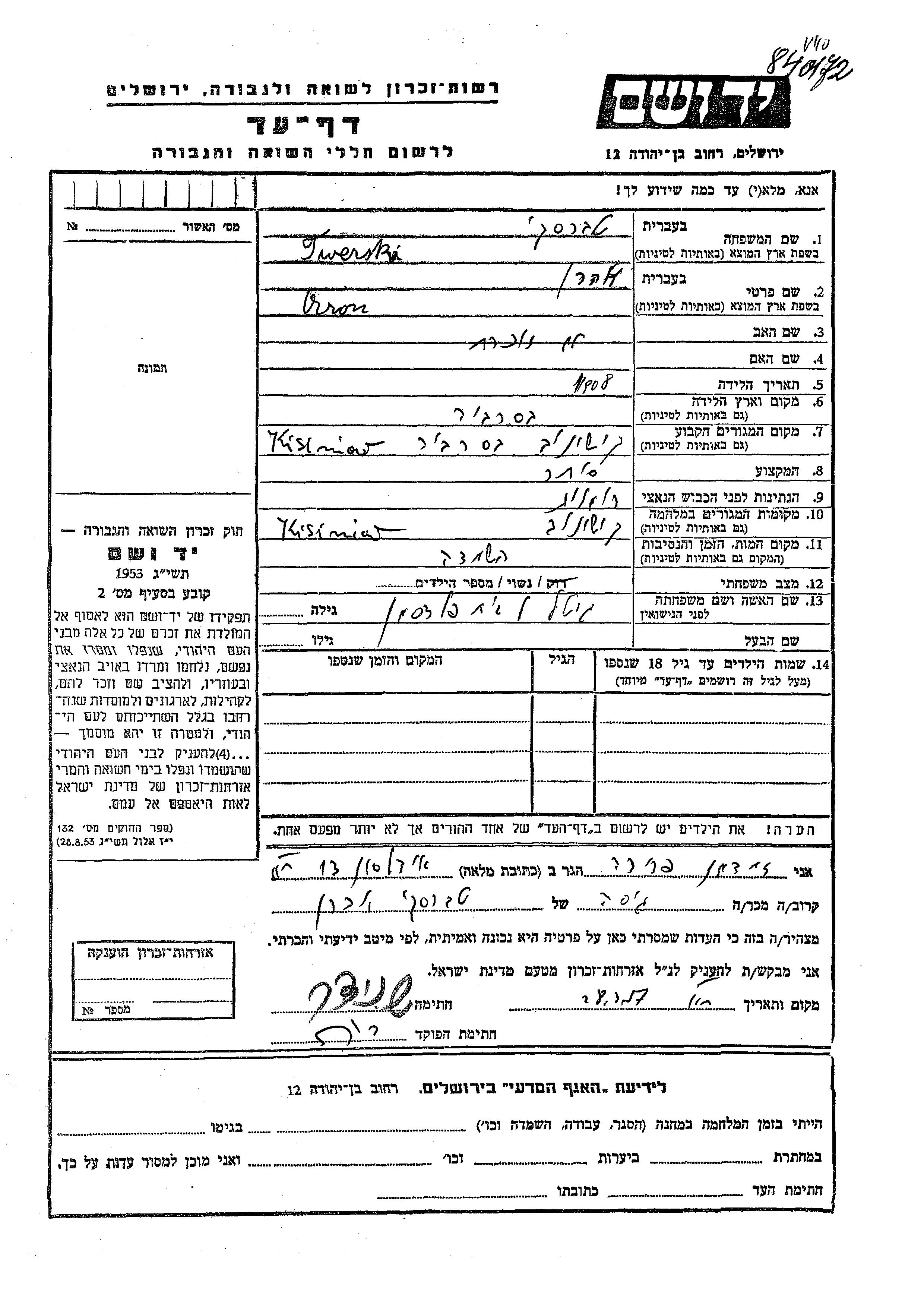 Aron Twerski wurde im Jahr 1908 in Bessarabia, Rumänien geboren. Er war Kaufmann/-frau und mit Gitel, geb. Feldsman Verheiratet. Vor dem Zweiten Weltkrieg lebte er in Kishinev, Rumänien. Während des Krieges war er in Kishinev, Rumänien.