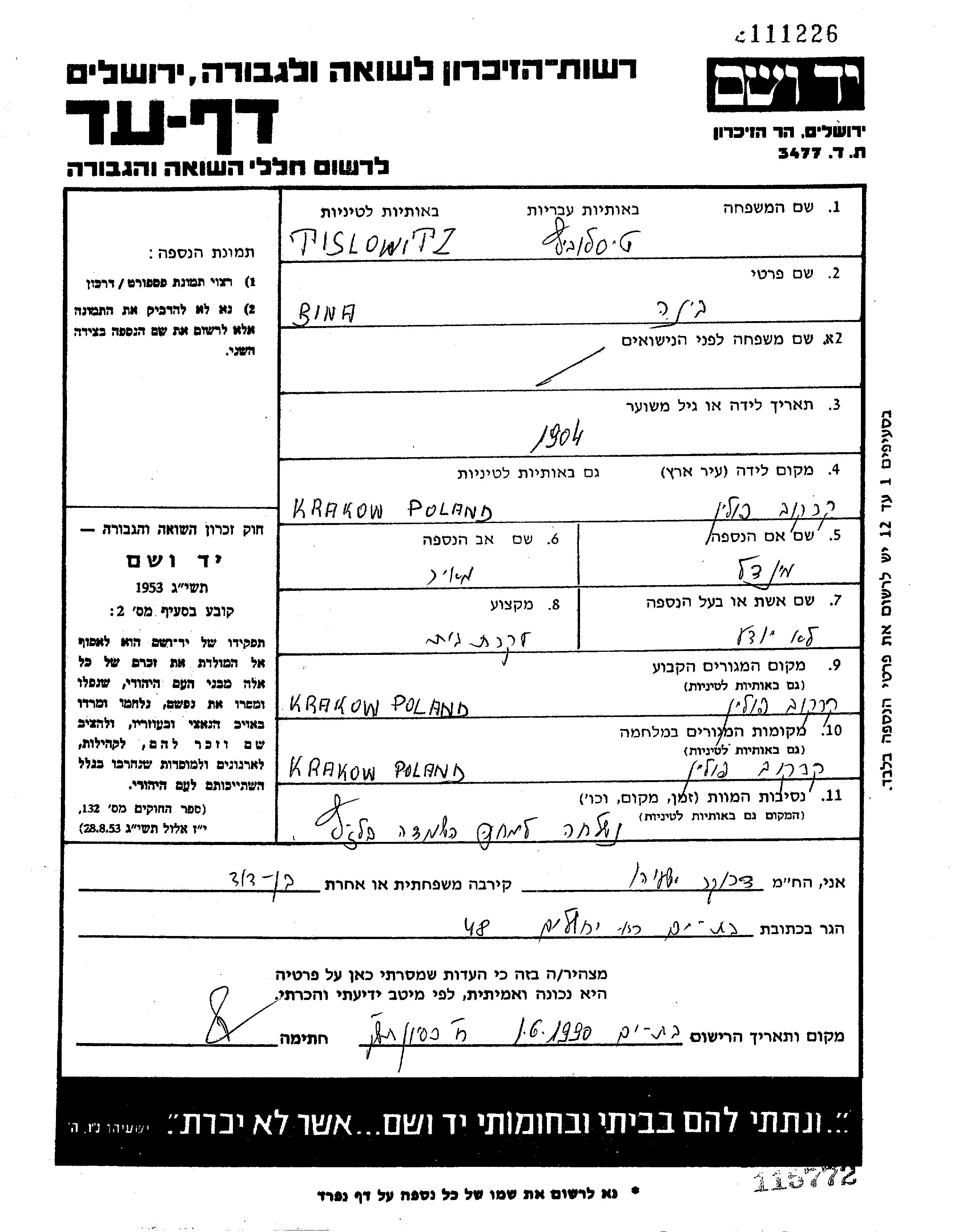 Bina Tislowitz wurde im Jahr 1904 in Krakow, Polen geboren. Sie war die Tochter von Meir und Mindl. Sie war Hausfrau. Vor dem Zweiten Weltkrieg lebte sie in Krakow, Polen. Während des Krieges war sie in Krakow, Polen.