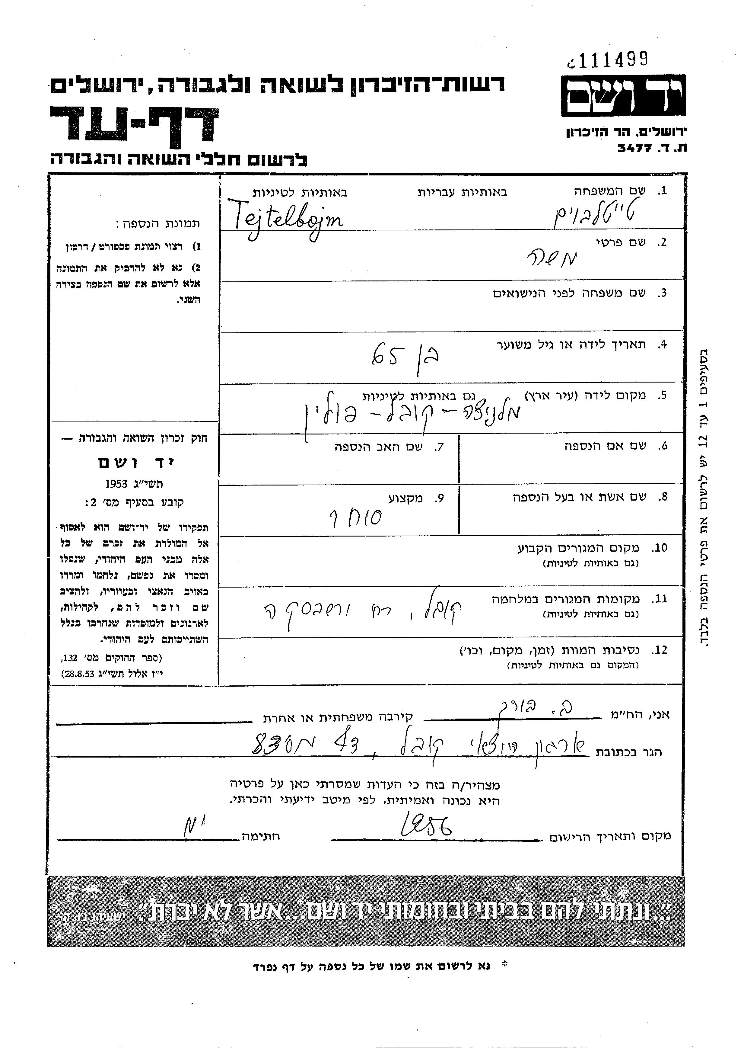Moshe Tejtelbojm wurde in Mielnica, Polen geboren. Er war Kaufmann/-frau. Vor dem Zweiten Weltkrieg lebte er in Kowel, Polen. Während des Krieges war er in Kowel, Polen.