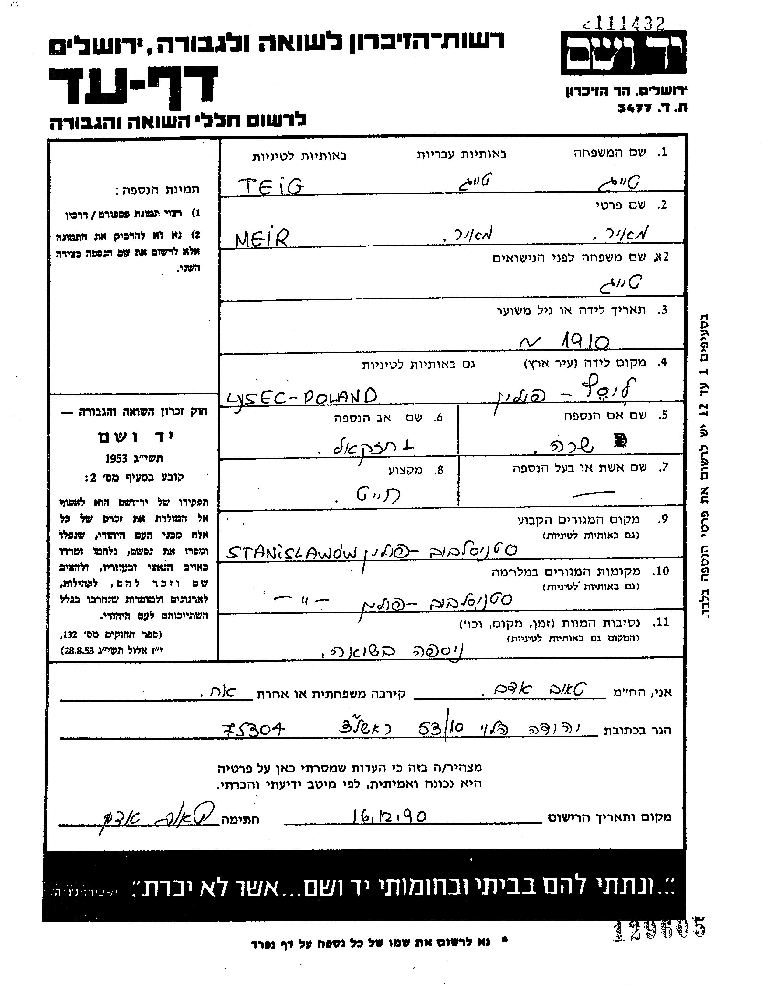 Meir Teig wurde im Jahr 1910 in Lysiec, Polen geboren. Er war der Sohn von Chaskel und Sara. Er war Schneider. Vor dem Zweiten Weltkrieg lebte er in Stanislawow, Polen. Während des Krieges war er in Stanislawow, Polen.
