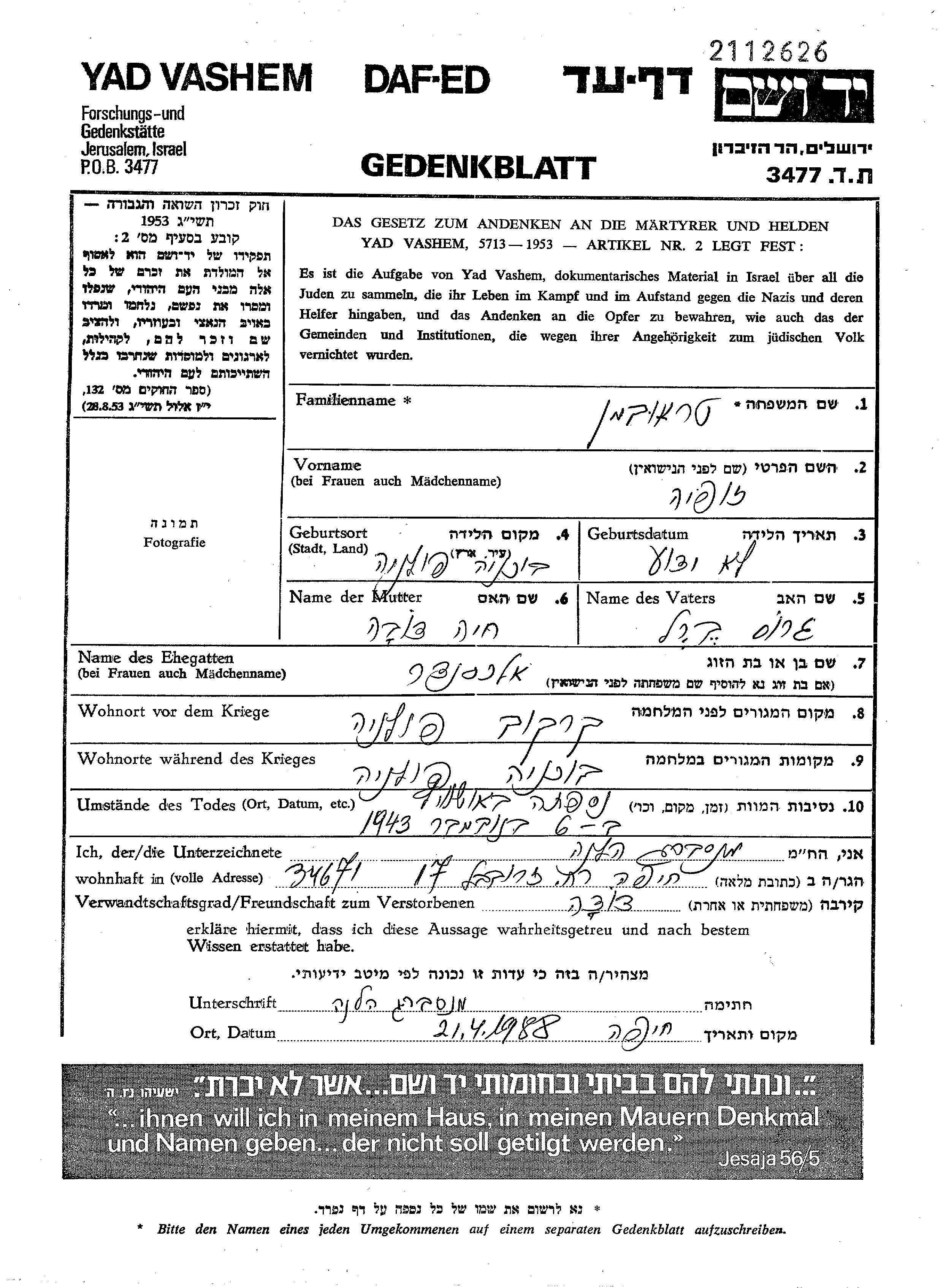 Traubman Zofia Krakow, Polen Gedenkblatt