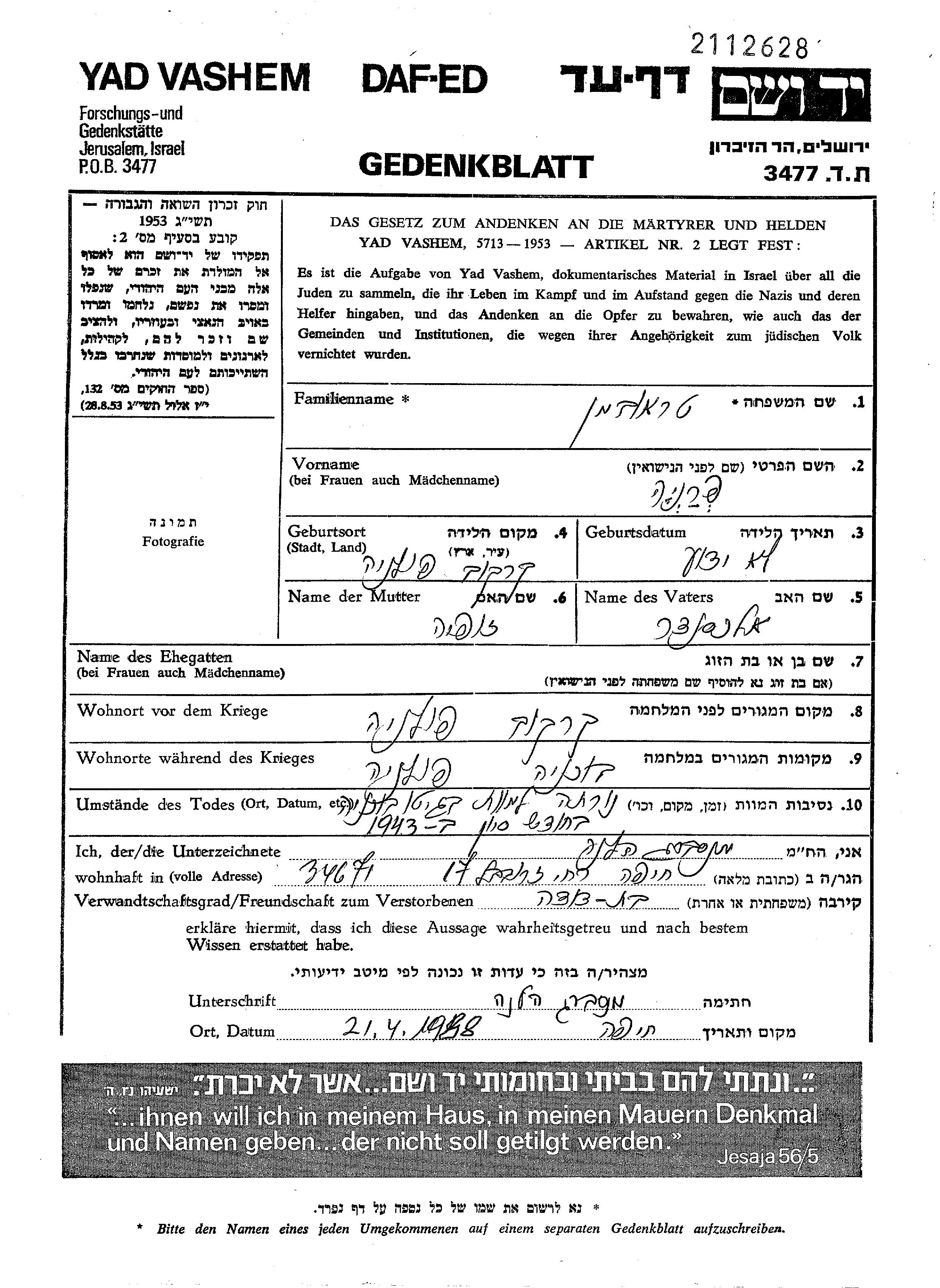 Yad Vashem - Gedenkblätter Sammlung