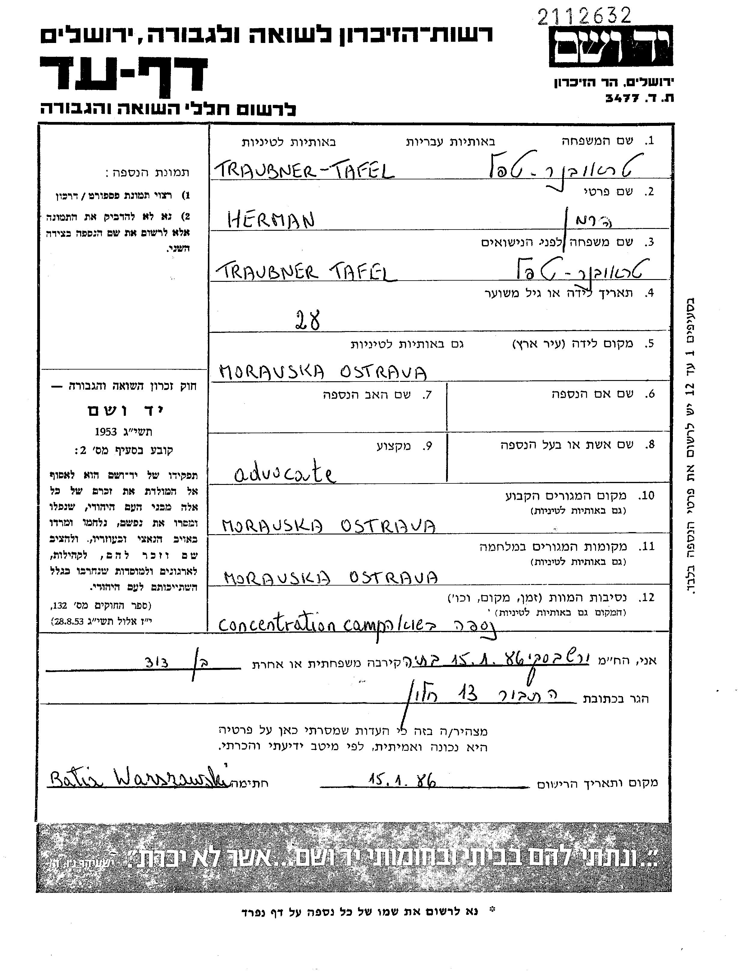 Herman Traubner Tepel wurde in Moravska Ostrava, Tschechoslowakei geboren. Er war Rechtsanwalt/rechtsanwältin. Vor dem Zweiten Weltkrieg lebte er in Moravska Ostrava, Tschechoslowakei. Während des Krieges war er in Moravska Ostrava, Tschechoslowakei.