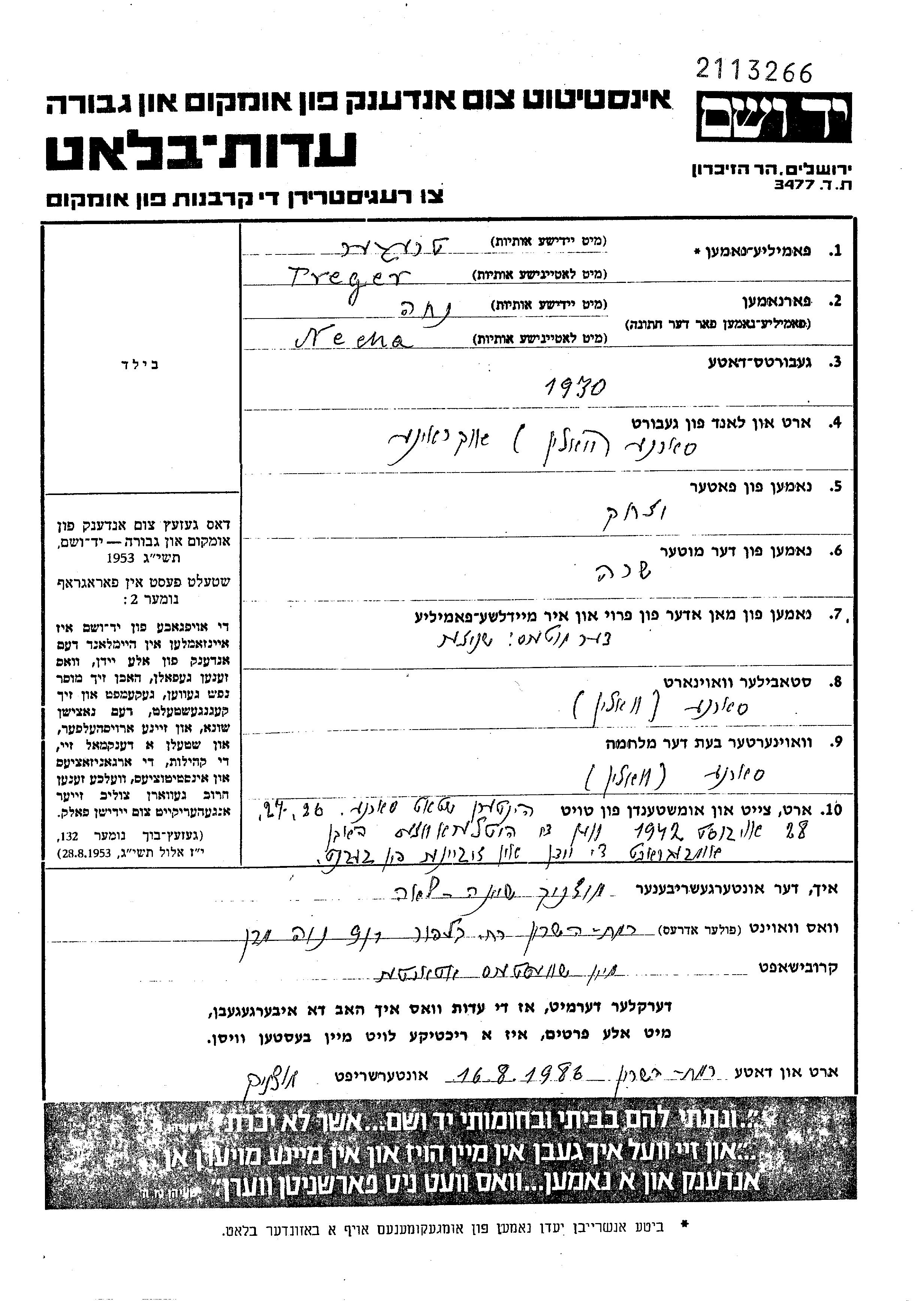 Necha Treger wurde im Jahr 1930 in Sarny, Polen geboren. Sie war die Tochter von Icchak und Sara. Sie war Kind. Vor dem Zweiten Weltkrieg lebte sie in Sarny, Polen. Während des Krieges war sie in Sarny, Polen.