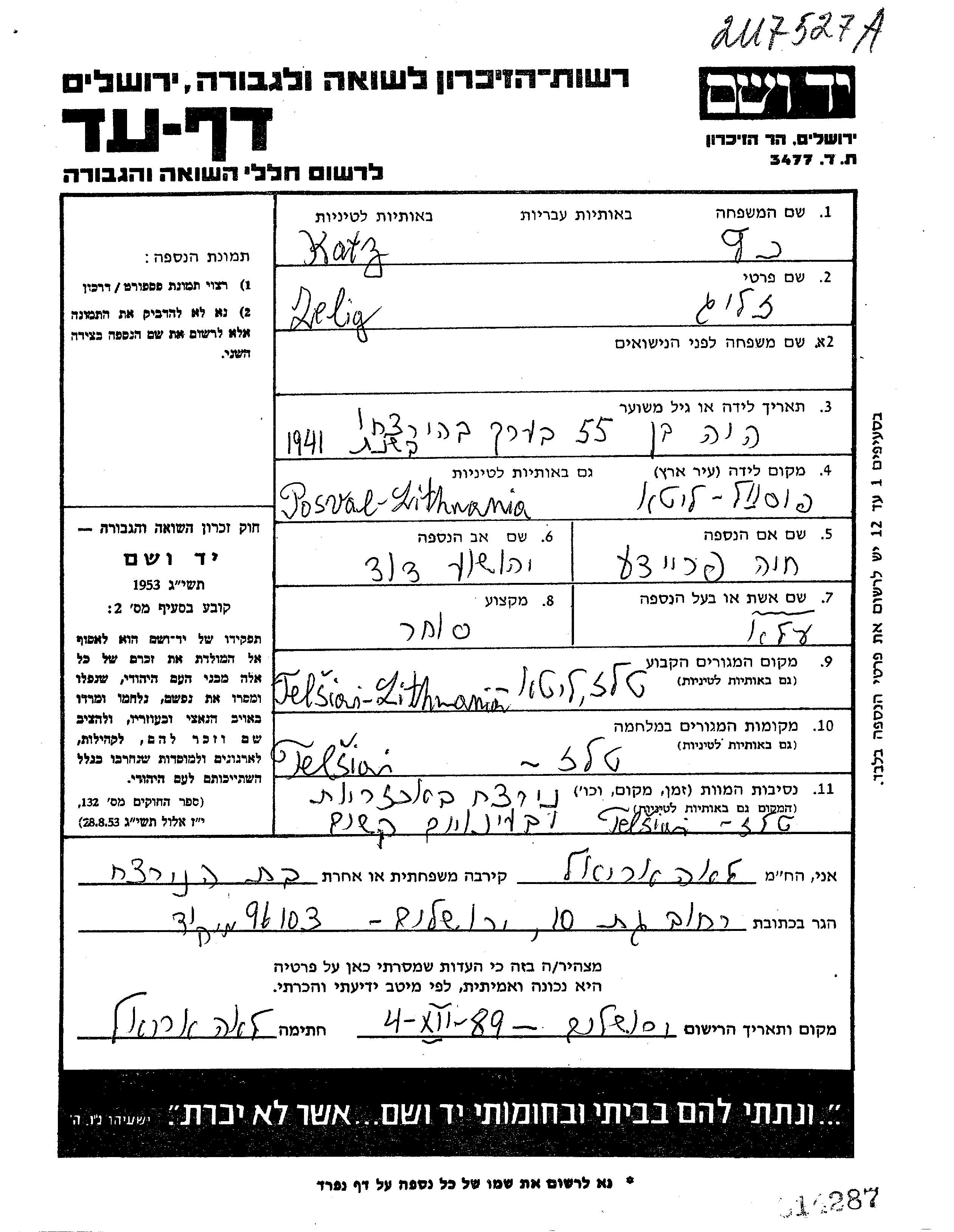 Zelig Katz wurde in Posval, Litauen geboren. Er war der Sohn von Yehoshua David und Khaia Freide. Er war Kaufmann/-frau. Vor dem Zweiten Weltkrieg lebte er in Telsiai, Litauen. Während des Krieges war er in Telsiai, Litauen.