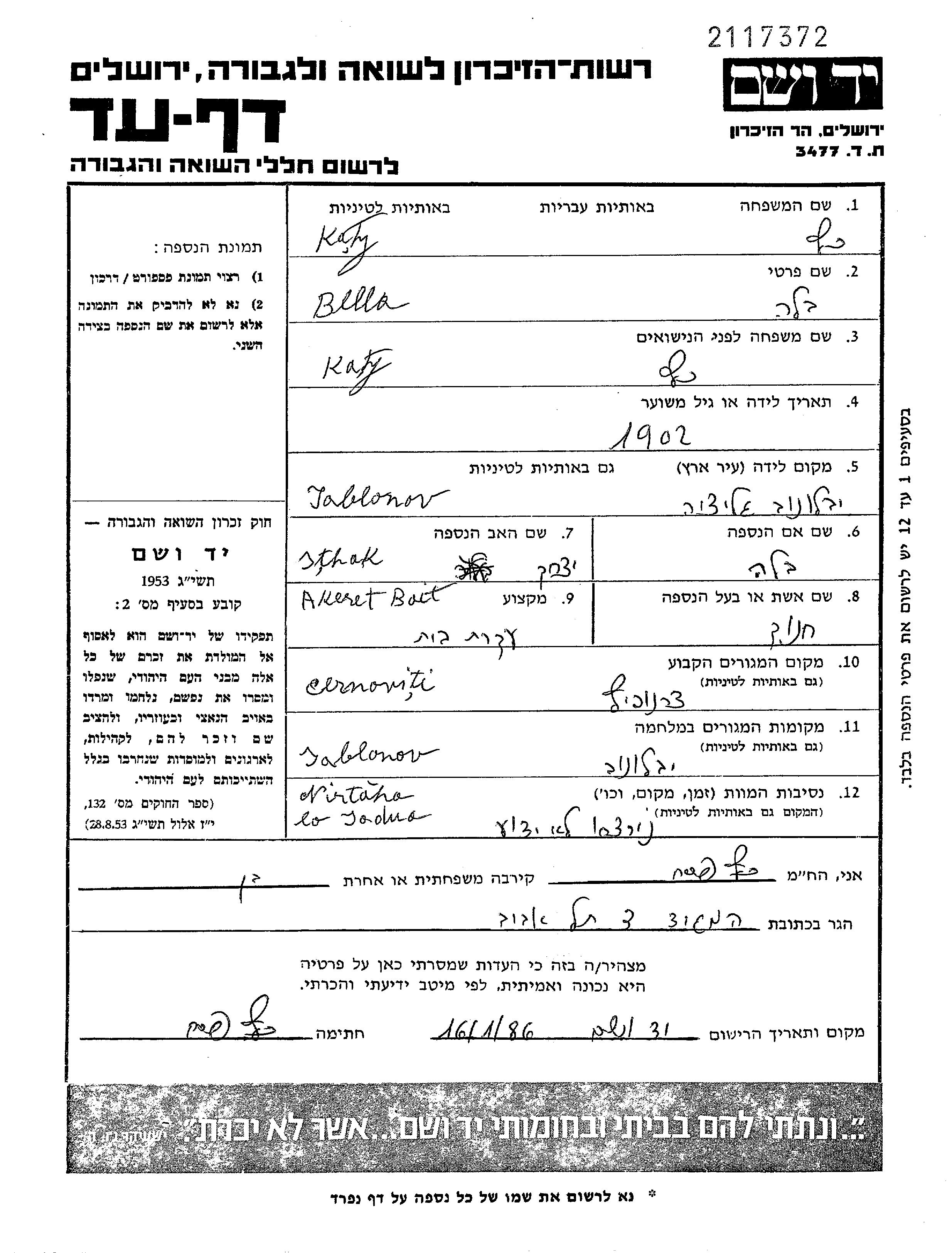 Bella Katz, geb. Katz wurde im Jahr 1902 in Jablonow, Polen geboren. Sie war die Tochter von Ithak. Sie war Hausfrau und mit Khanokh Verheiratet. Vor dem Zweiten Weltkrieg lebte sie in Cernauti, Rumänien. Während des Krieges war sie in Jablonow, Polen.
