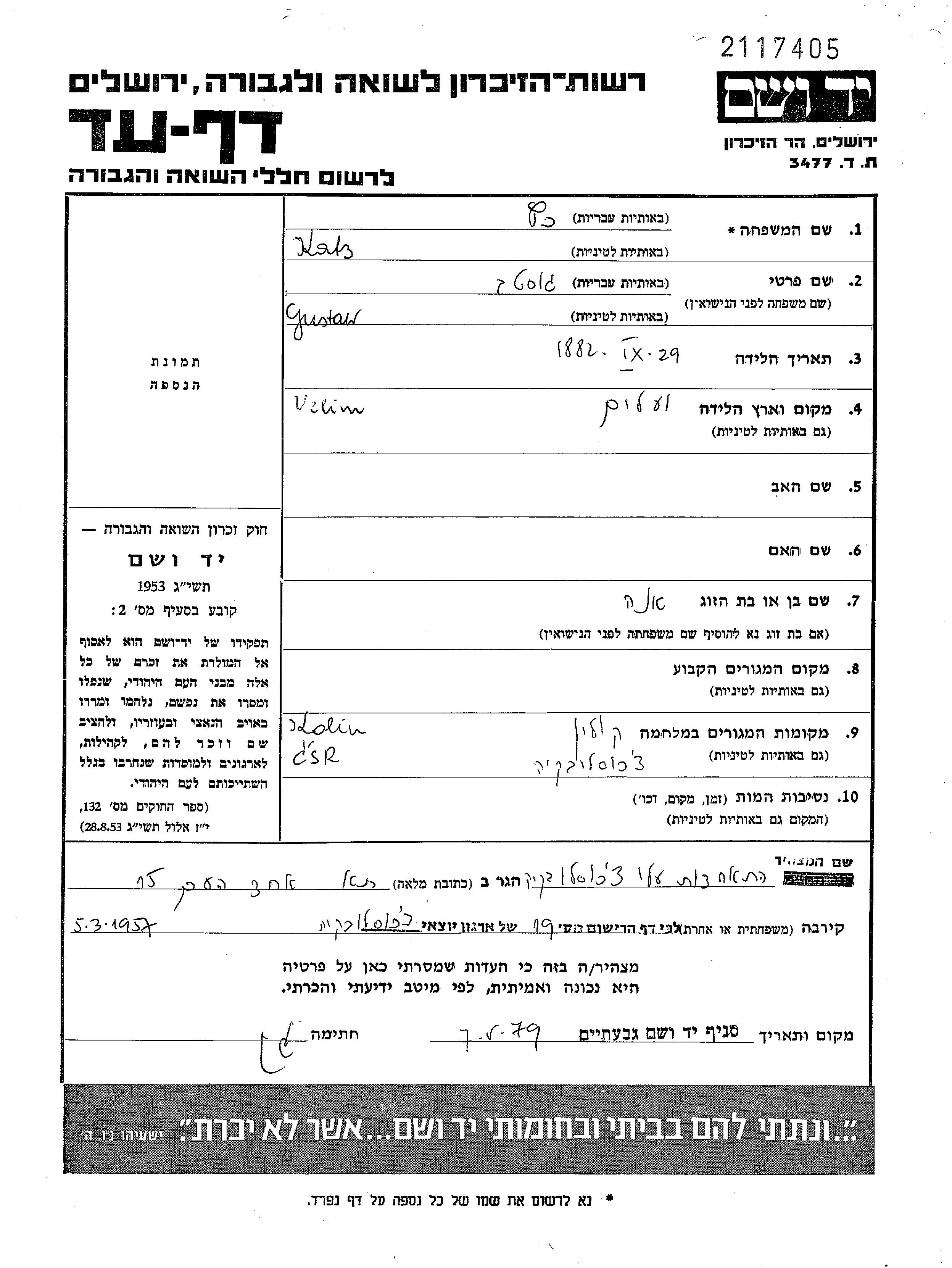 Gustaw Katz wurde im Jahr 1882 in Velim, Tschechoslowakei geboren. Er war mit Ana Verheiratet. Vor dem Zweiten Weltkrieg lebte er in Kolin, Tschechoslowakei. Während des Krieges war er in Kolin, Tschechoslowakei.