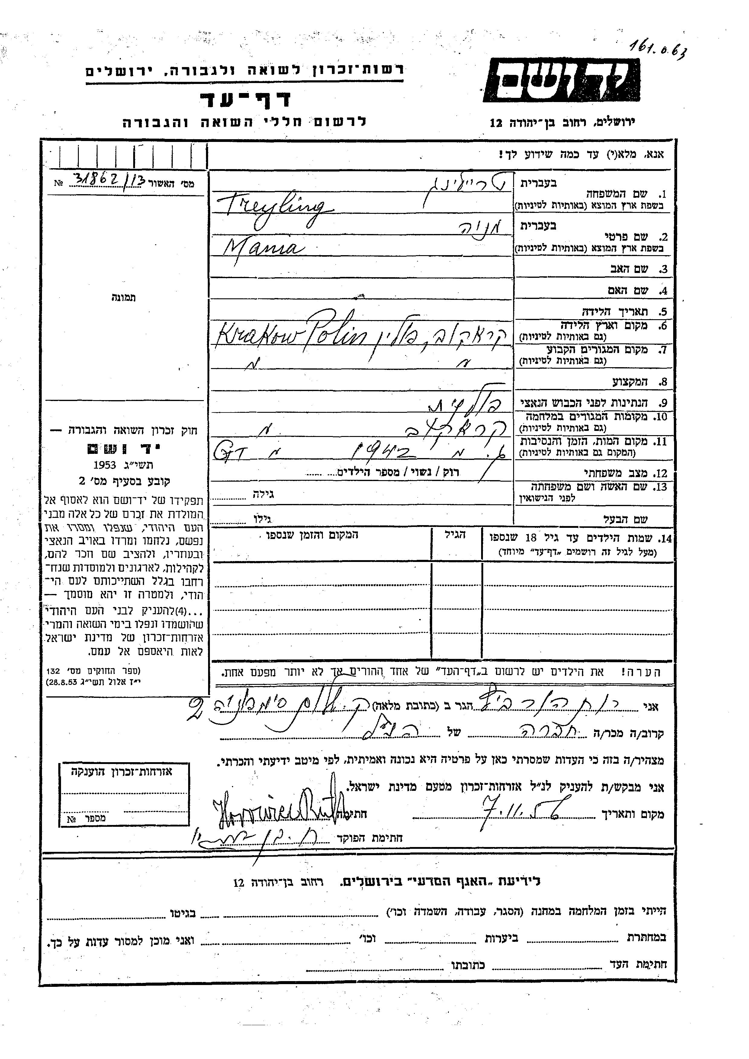 Mania Treyling wurde in Krakow, Polen geboren. Vor dem Zweiten Weltkrieg lebte sie in Krakow, Polen. Während des Krieges war sie in Krakow, Polen.