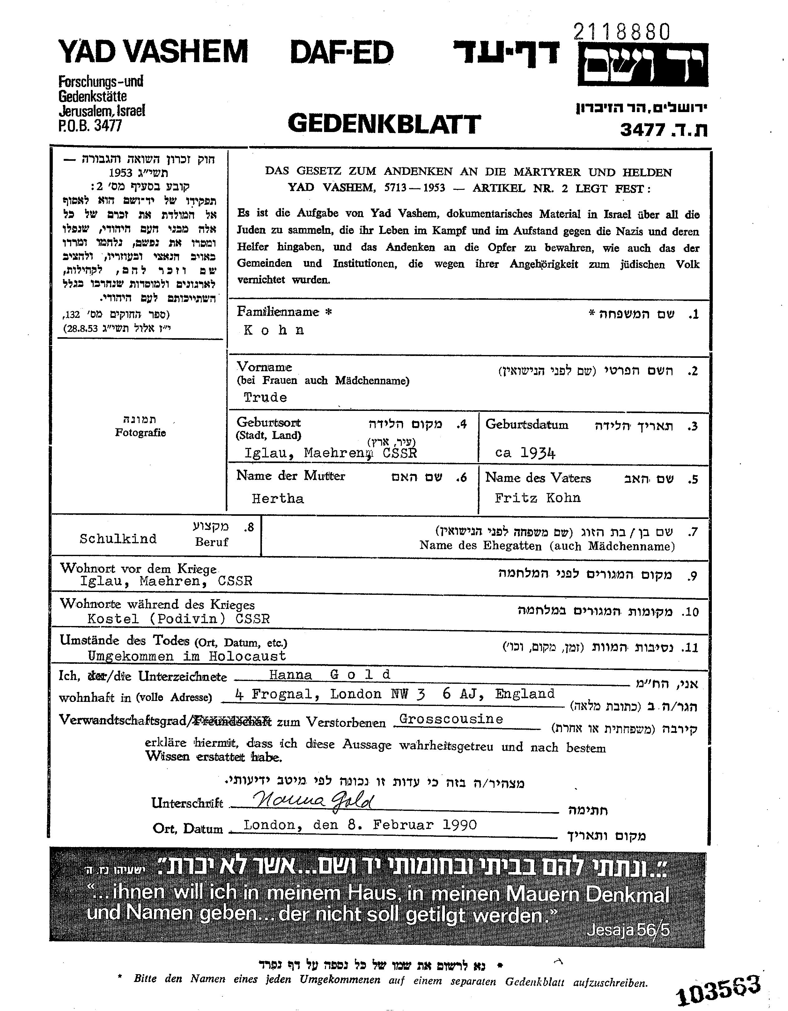 Trude Kohn Kun wurde im Jahr 1934 in Iglau, Tschechoslowakei geboren. Sie war die Tochter von Fritz und Hertha. Sie war Schüler/-in und Kind. Vor dem Zweiten Weltkrieg lebte sie in Iglau, Tschechoslowakei. Während des Krieges war sie in Kostel, Tschechoslowakei.