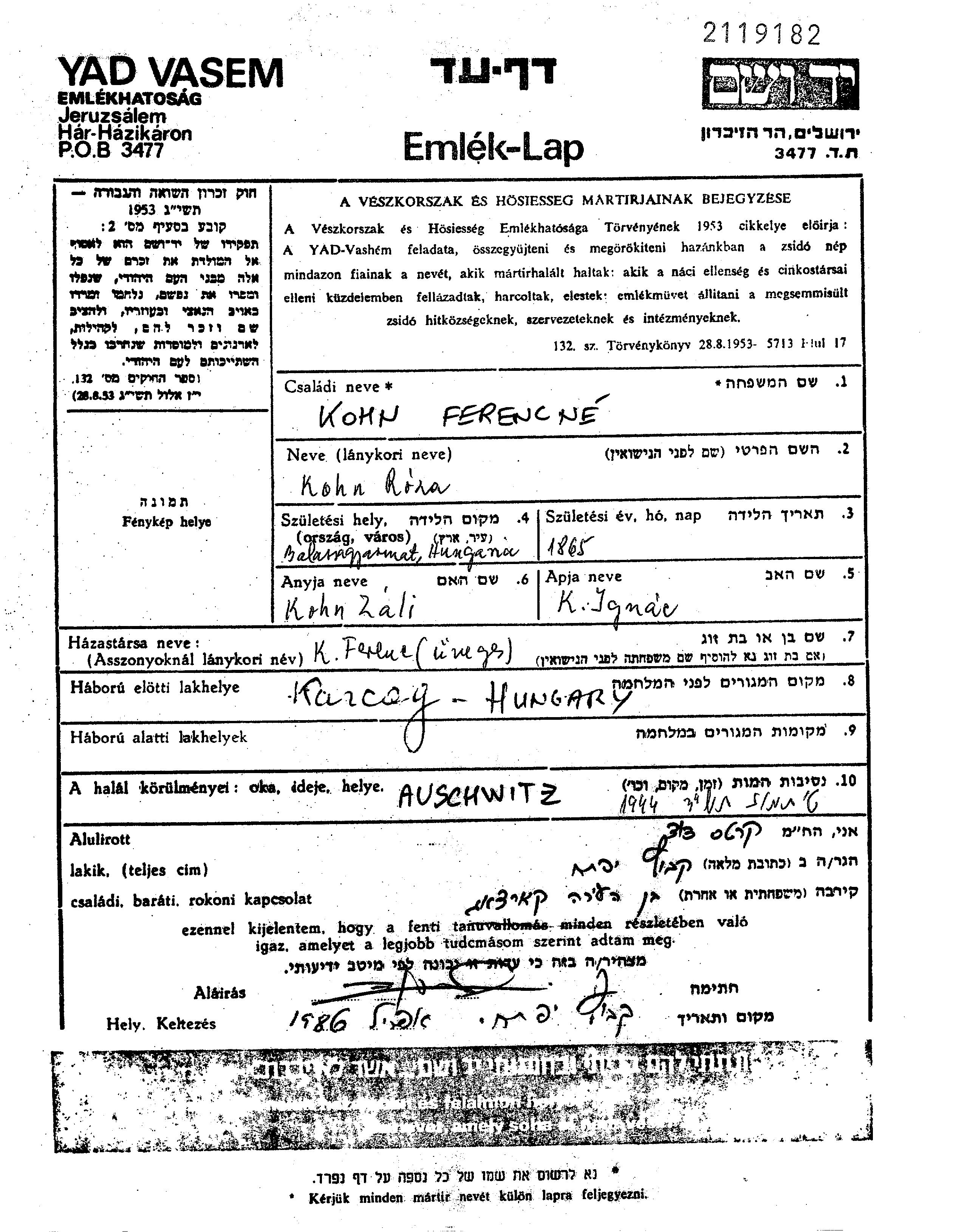 Roza Kohn Kun, geb. Kohn Kun wurde im Jahr 1865 in Balassagyarmat, Ungarn geboren. Sie war die Tochter von Ignac und Zali. Sie war mit Ferentz Verheiratet. Vor dem Zweiten Weltkrieg lebte sie in Karcag, Ungarn. Während des Krieges war sie in Karcag, Ungarn.