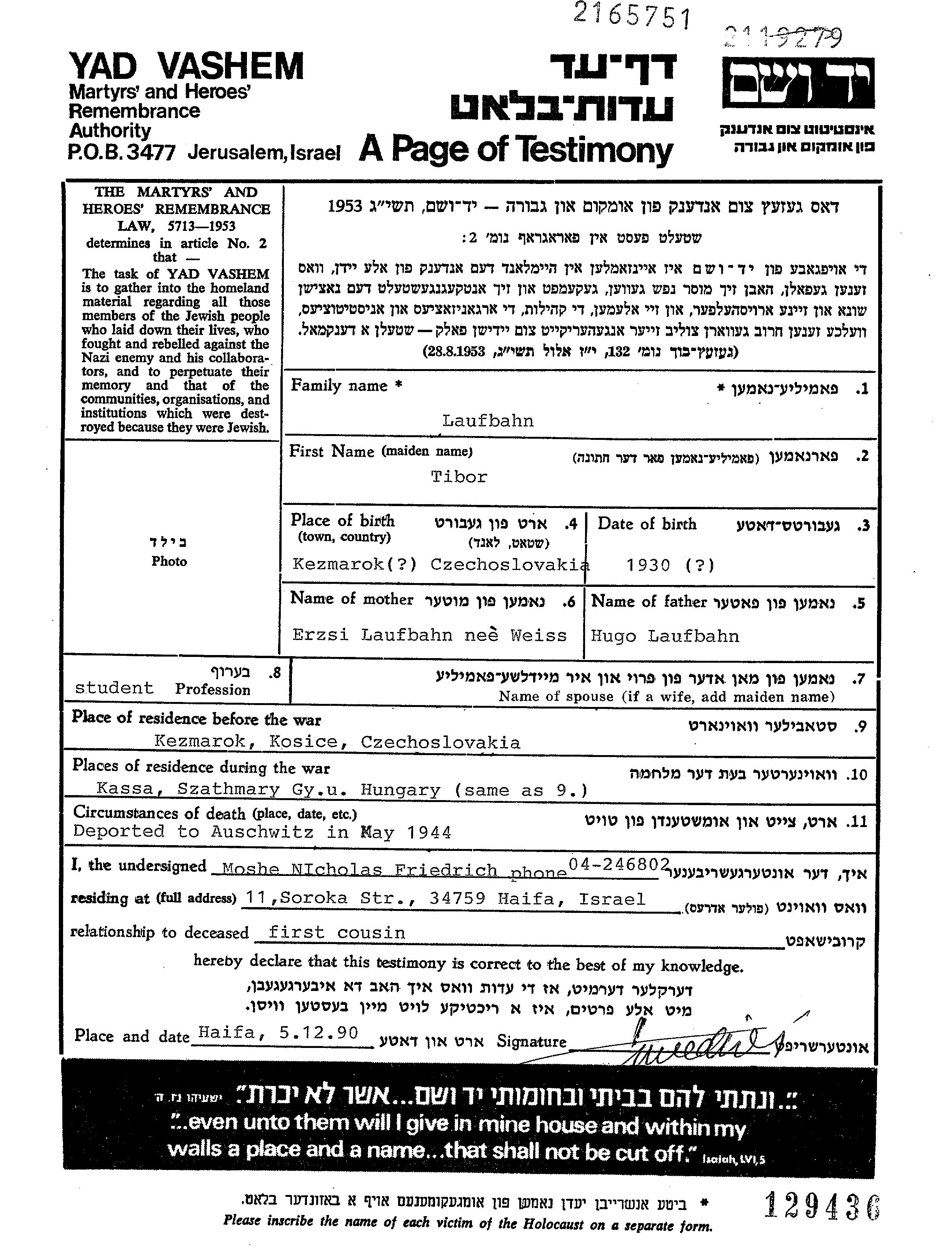 Tibor Laufbahn wurde im Jahr 1930 in Kezmarok, Tschechoslowakei geboren. Er war der Sohn von Hugo und Erzsi. Er war Schüler/-in und Kind. Vor dem Zweiten Weltkrieg lebte er in Kosice, Tschechoslowakei. Während des Krieges war er in Kassa, Tschechoslowakei.