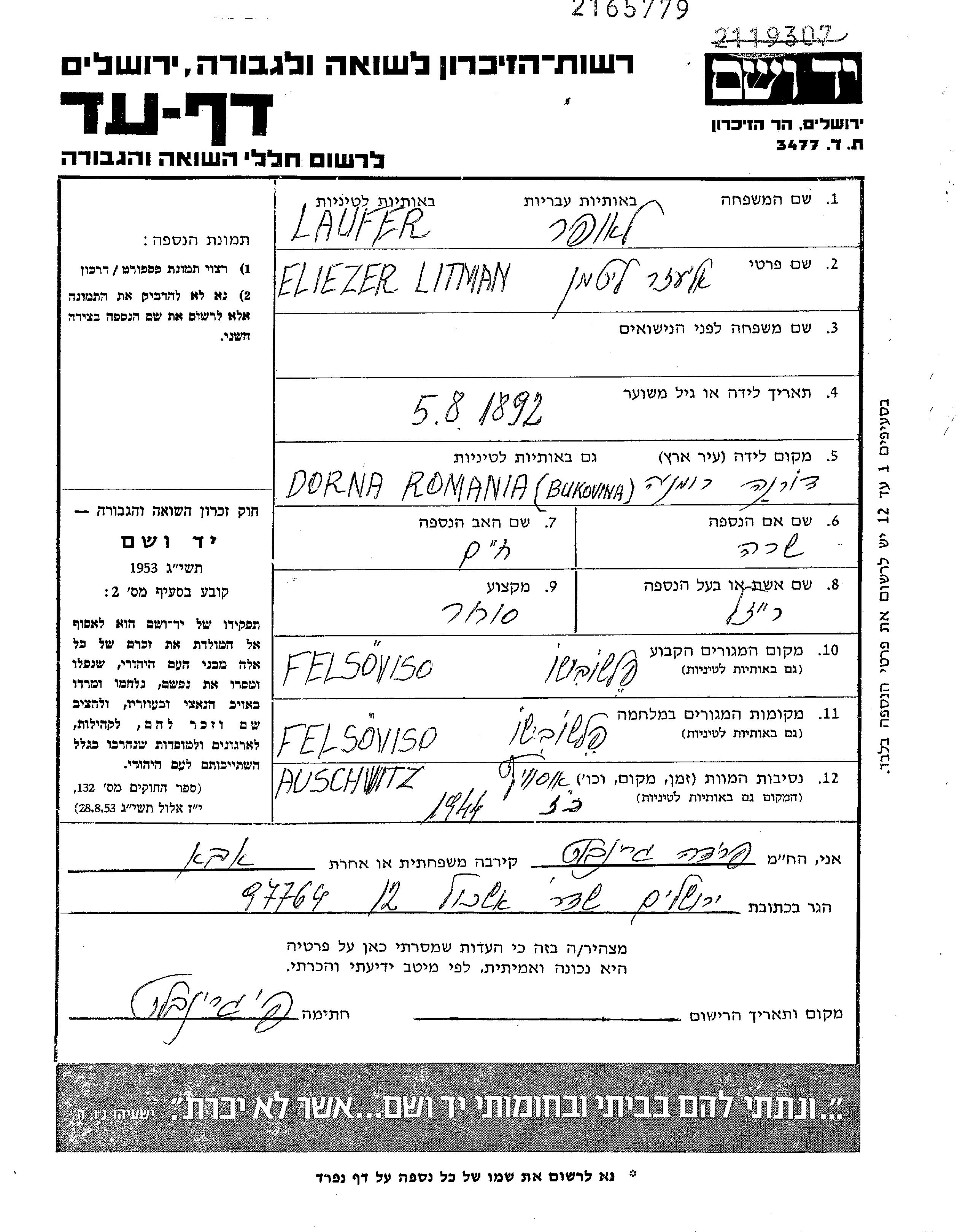 Eliezer Litman Laufer wurde im Jahr 1892 in Dorna, Rumänien geboren. Er war der Sohn von Chaim und Sara. Er war Kaufmann/-frau und mit Rezl Verheiratet. Vor dem Zweiten Weltkrieg lebte er in Felsoviso, Rumänien. Während des Krieges war er in Felsoviso, Rumänien.