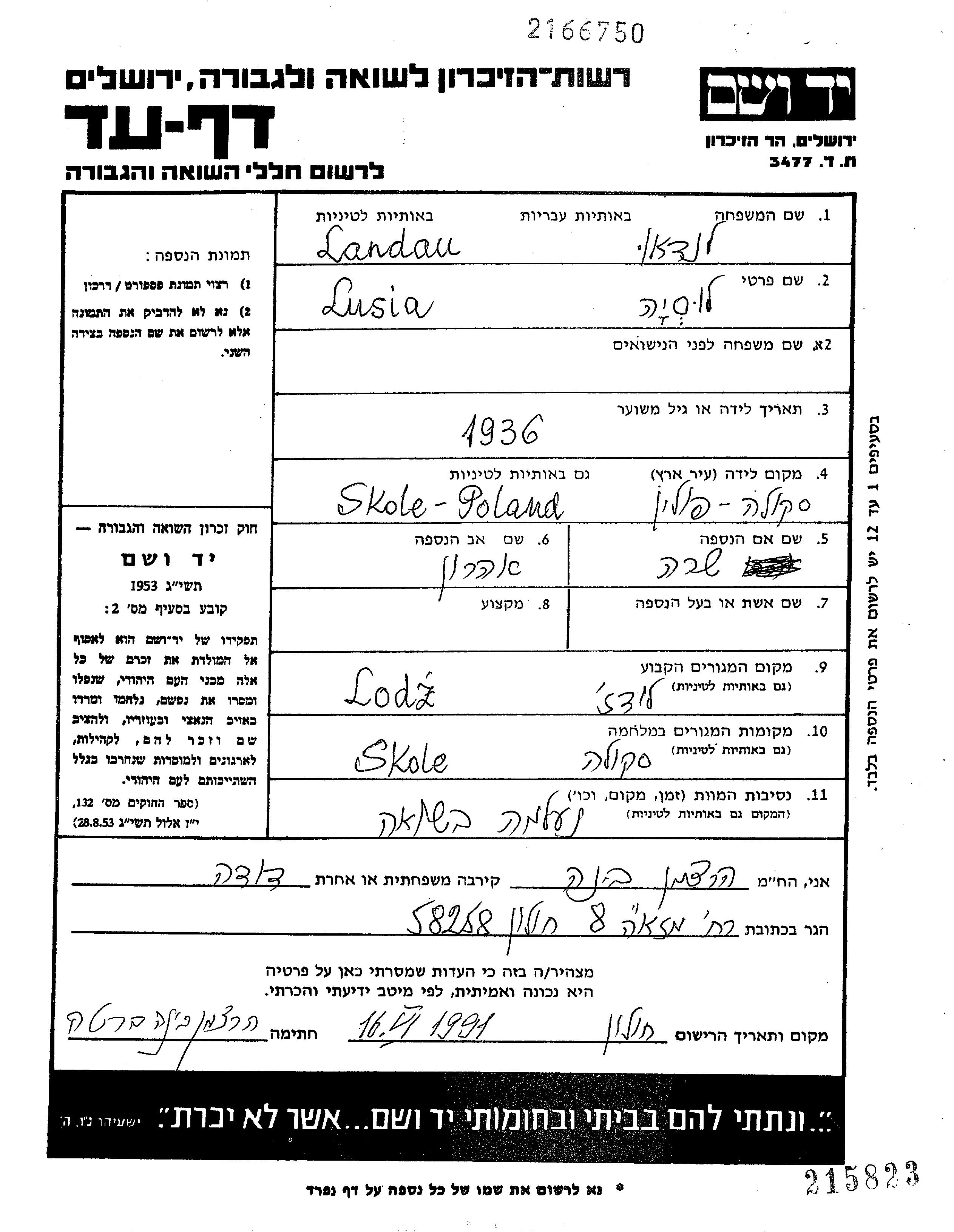 Lusia Landau wurde im Jahr 1936 in Skole, Polen geboren. Sie war die Tochter von Aharon und Sara. Sie war Kind. Vor dem Zweiten Weltkrieg lebte sie in Lodz, Polen. Während des Krieges war sie in Skole, Polen.