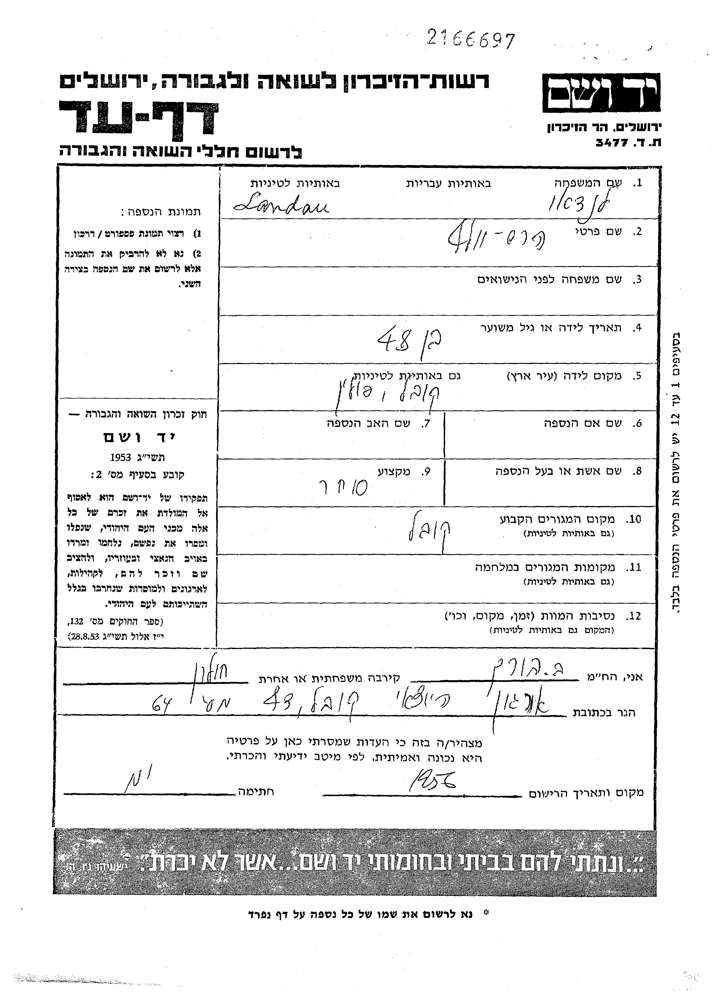 Hersh Volf Landau wurde in Kowel, Polen geboren. Er war Kaufmann/-frau. Vor dem Zweiten Weltkrieg lebte er in Kowel, Polen.