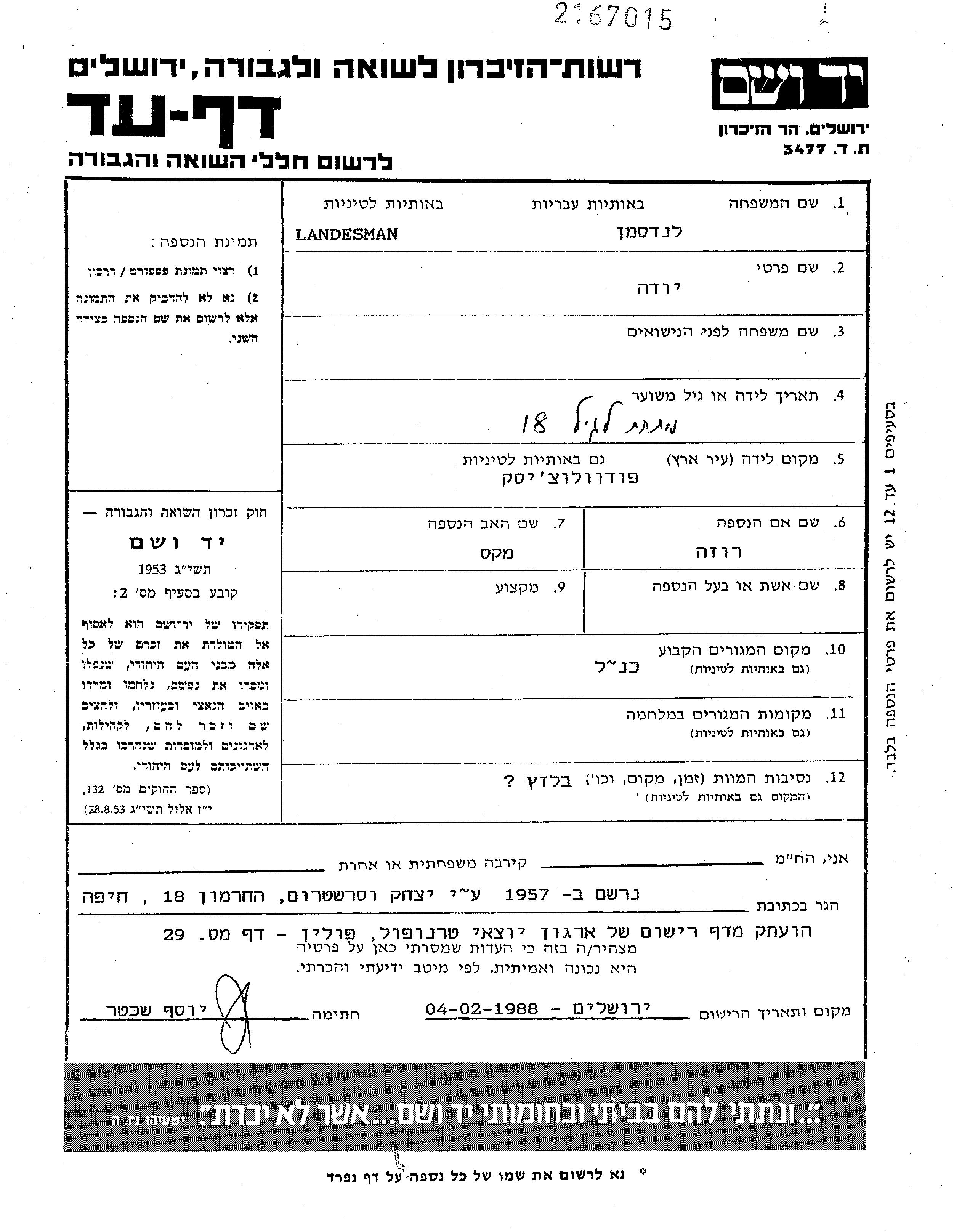 Juda Landesman wurde in Podwoloczyska, Polen geboren. Er war der Sohn von Max und Roza. Er war Kind. Vor dem Zweiten Weltkrieg lebte er in Podwoloczyska, Polen. Während des Krieges war er in Podwoloczyska, Polen.