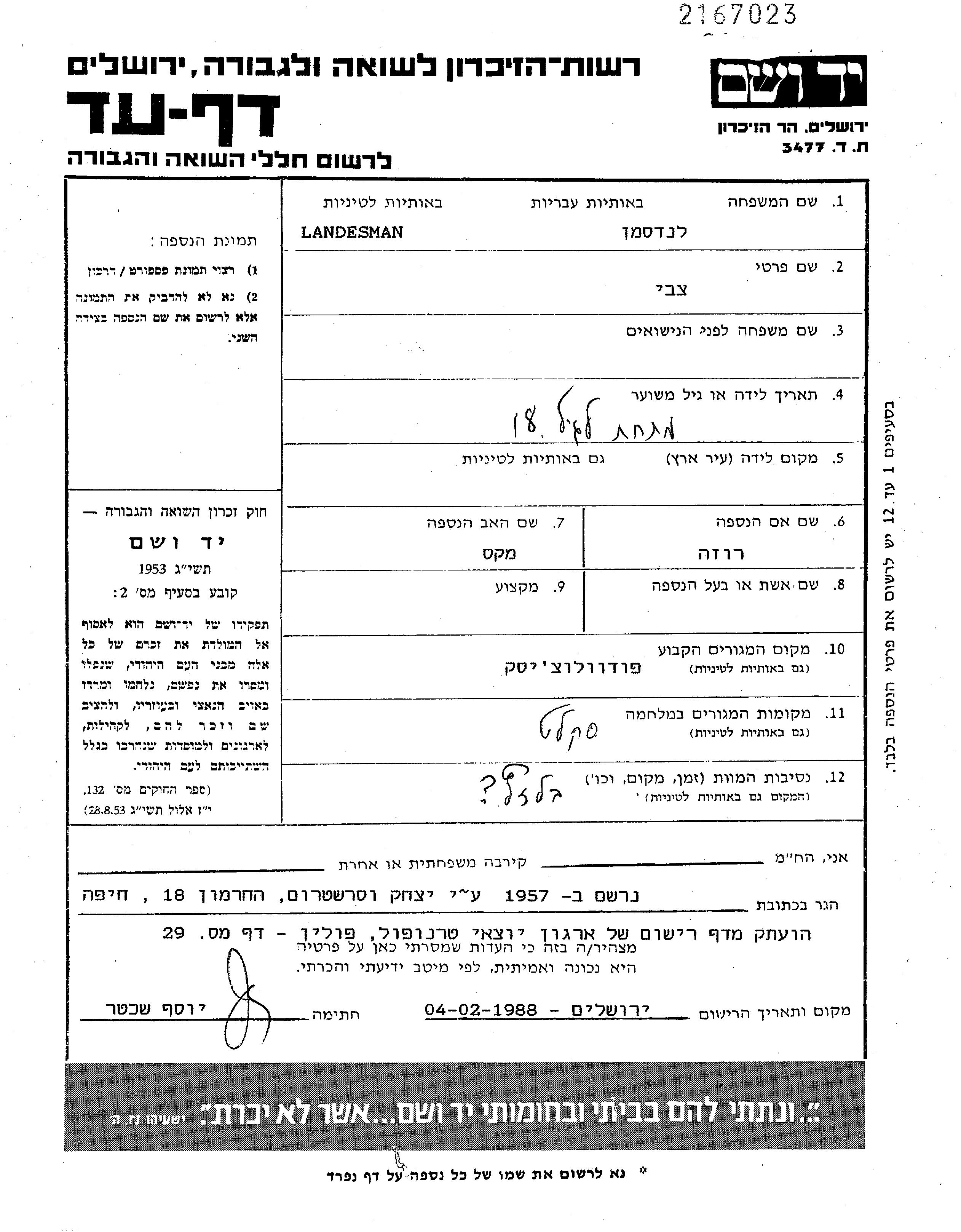Tzvi Landesman wurde Er war der Sohn von Max und Roza. Er war Kind. Vor dem Zweiten Weltkrieg lebte er in Podwoloczyska, Polen. Während des Krieges war er in Skalat, Polen.