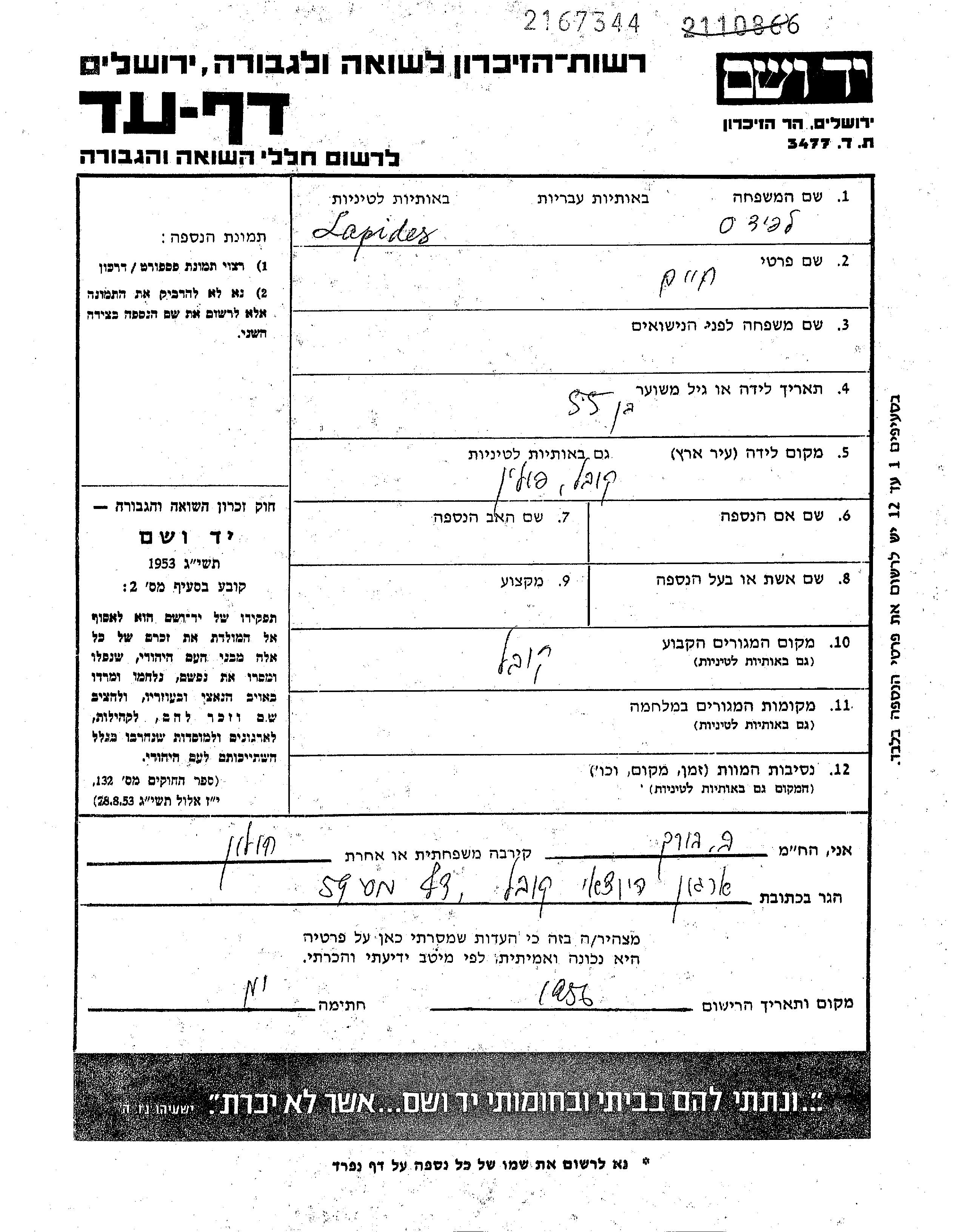 Khaim Lapides wurde in Kowel, Polen geboren. Vor dem Zweiten Weltkrieg lebte er in Kowel, Polen. Während des Krieges war er in Kowel, Polen.