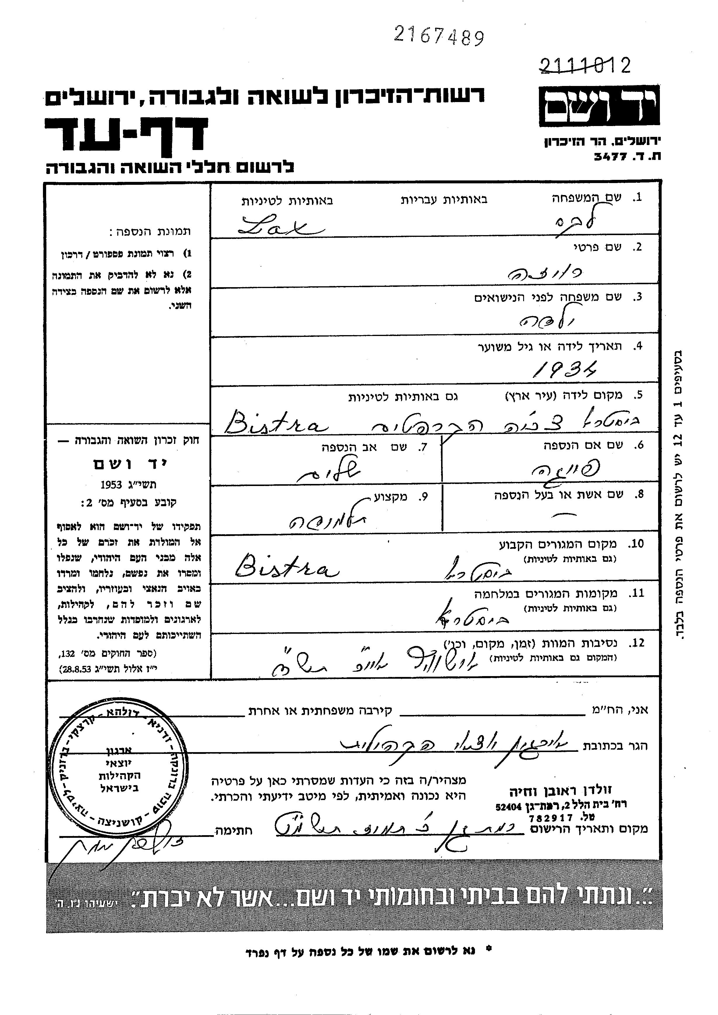 Roiza Lax wurde im Jahr 1934 in Bistre, Tschechoslowakei geboren. Sie war die Tochter von Sholom und Feiga. Sie war Schüler/-in und Kind. Vor dem Zweiten Weltkrieg lebte sie in Bistre, Tschechoslowakei. Während des Krieges war sie in Bistre, Tschechoslowakei.