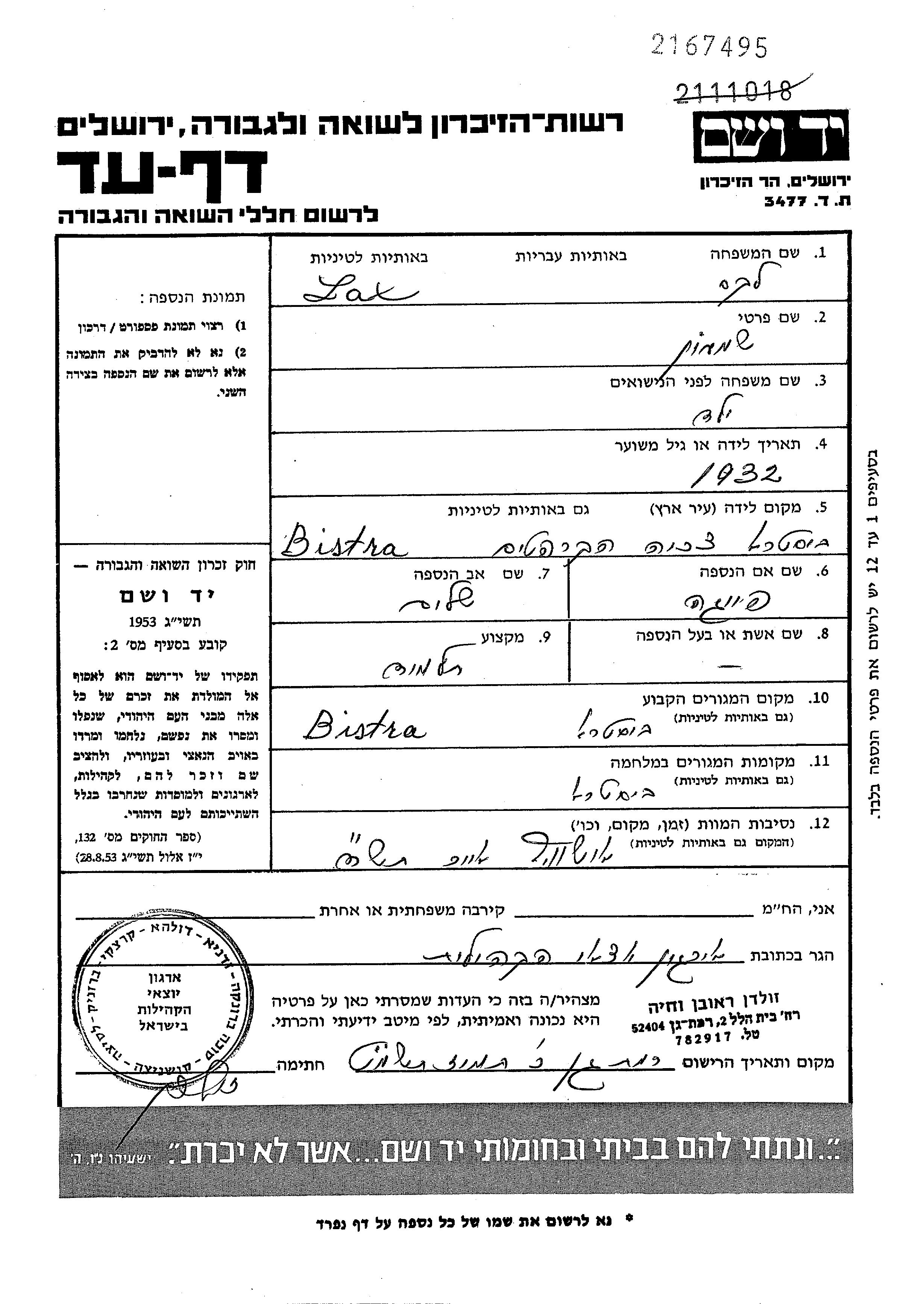 Shimon Lax wurde im Jahr 1932 in Bistre, Tschechoslowakei geboren. Er war der Sohn von Shalom und Feiga. Er war Schüler/-in und Kind. Vor dem Zweiten Weltkrieg lebte er in Bistre, Tschechoslowakei. Während des Krieges war er in Bistre, Tschechoslowakei.