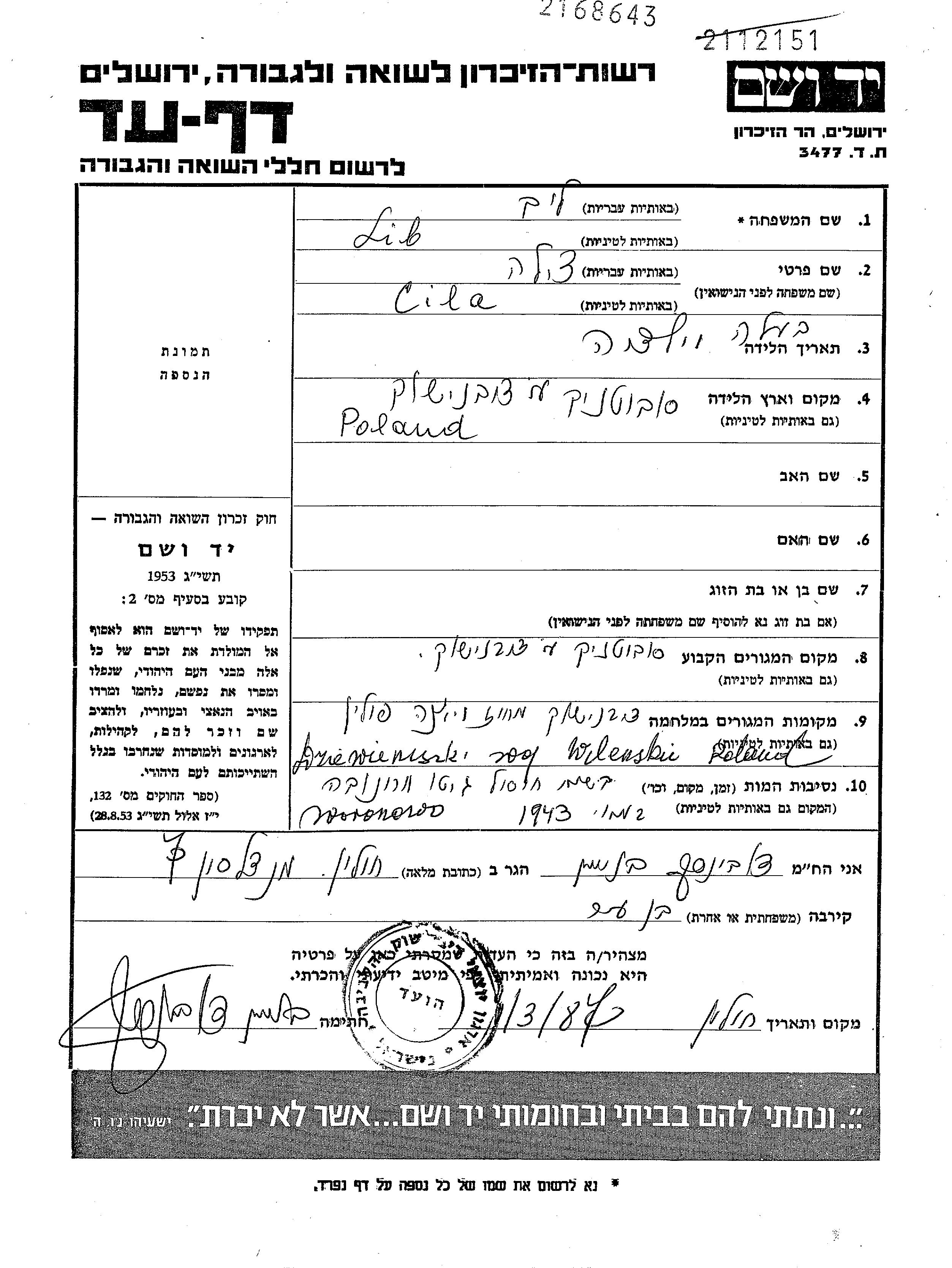 Cila Lib wurde in Subotniki, Polen geboren. Sie war Verheiratet. Vor dem Zweiten Weltkrieg lebte sie in Subotniki, Polen. Während des Krieges war sie in Dziewieniszki, Polen.