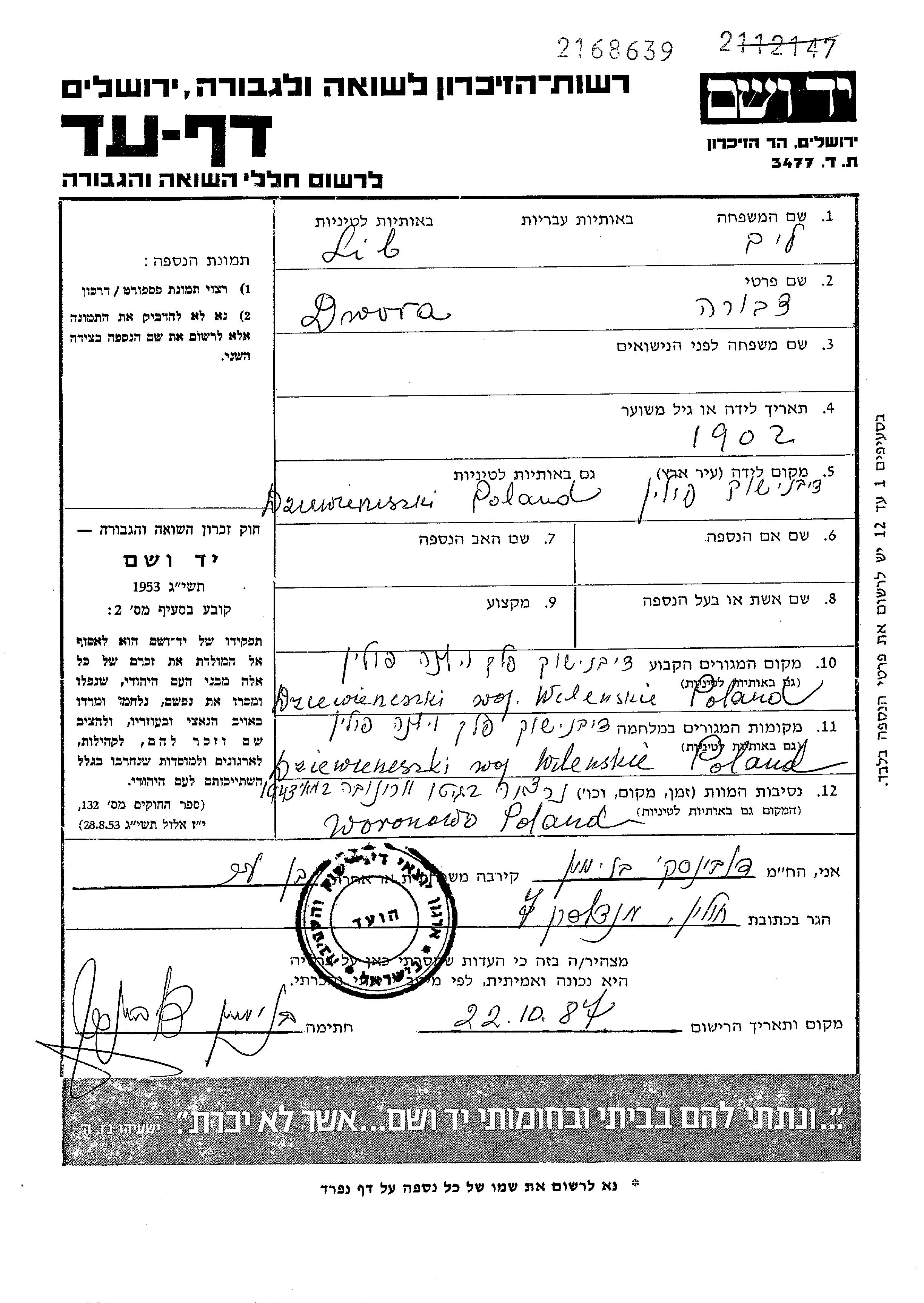 Dwora Lib wurde im Jahr 1902 in Dziewieniszki, Polen geboren. Vor dem Zweiten Weltkrieg lebte sie in Dziewieniszki, Polen. Während des Krieges war sie in Dziewieniszki, Polen.