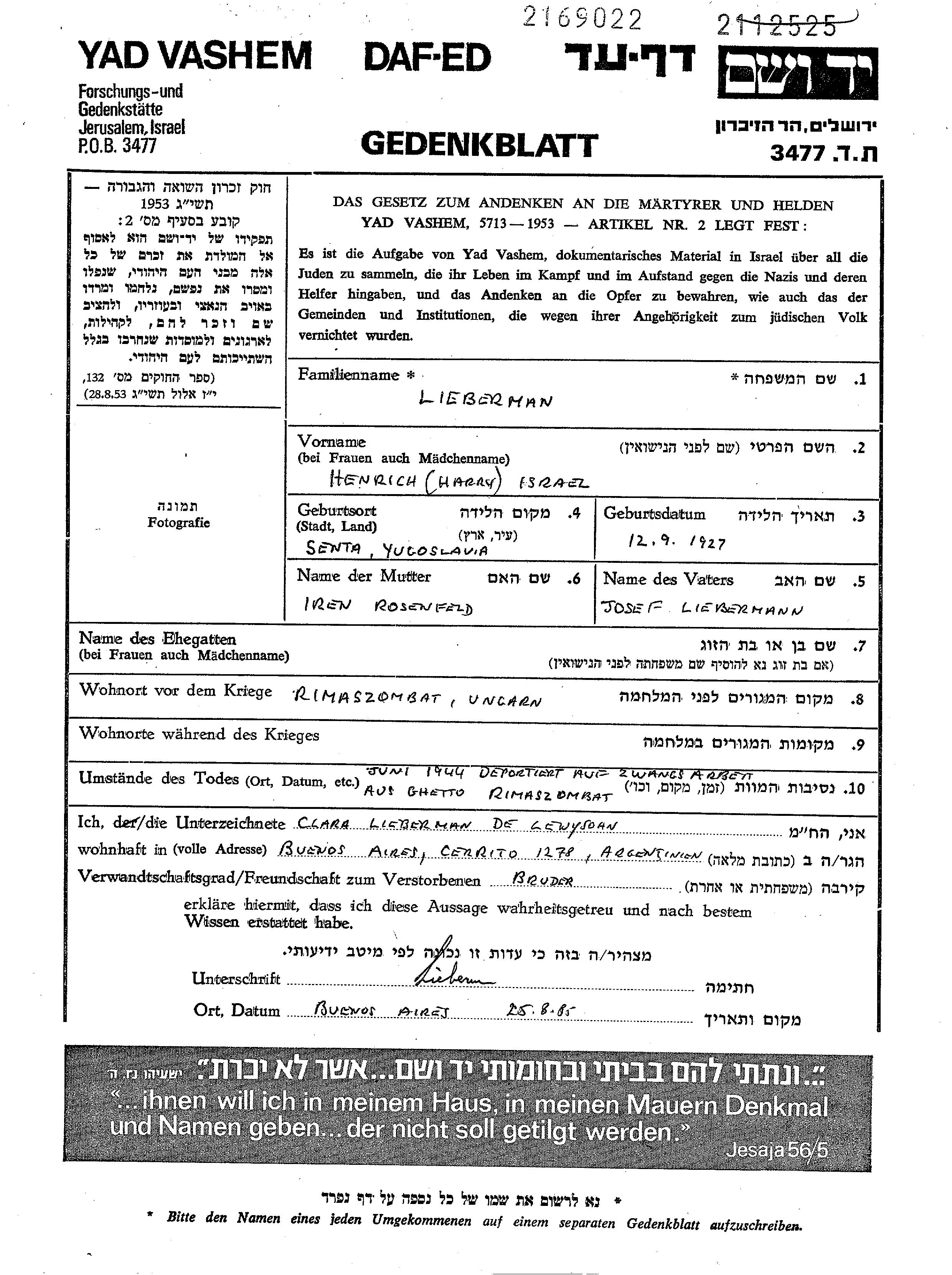 Lieberman Henrich Harry Israel 1927 Rimaszombat, Tschechoslowakei Gedenkblatt
