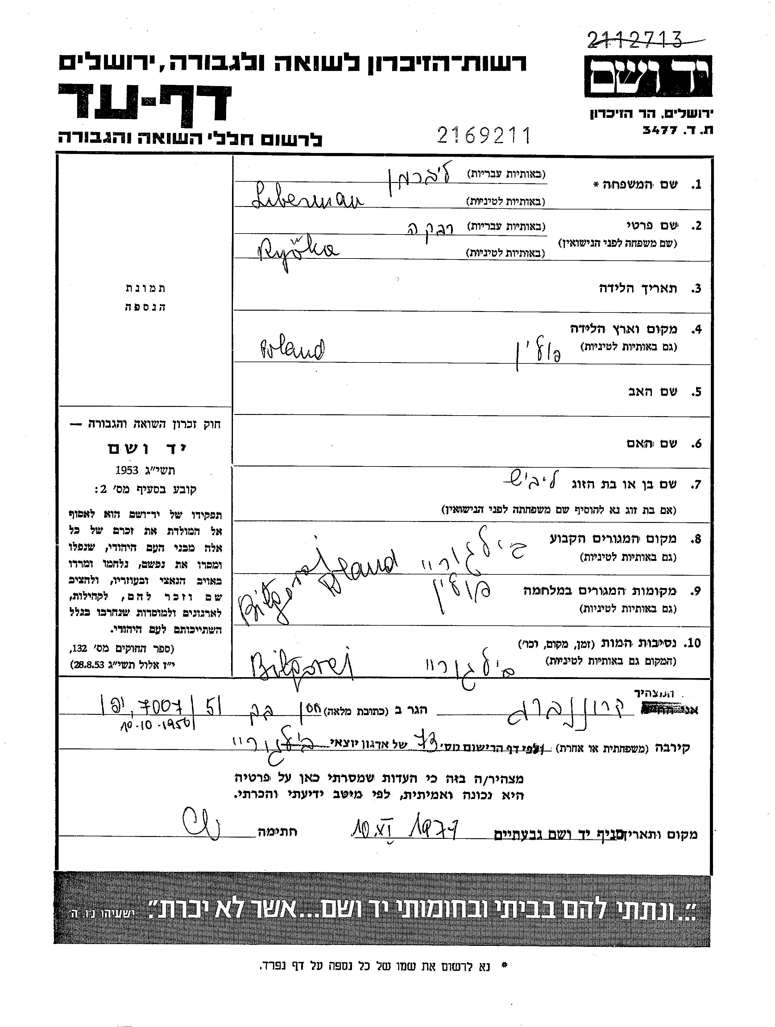 Liberman Rywka unbekannter Ort, Gedenkblatt