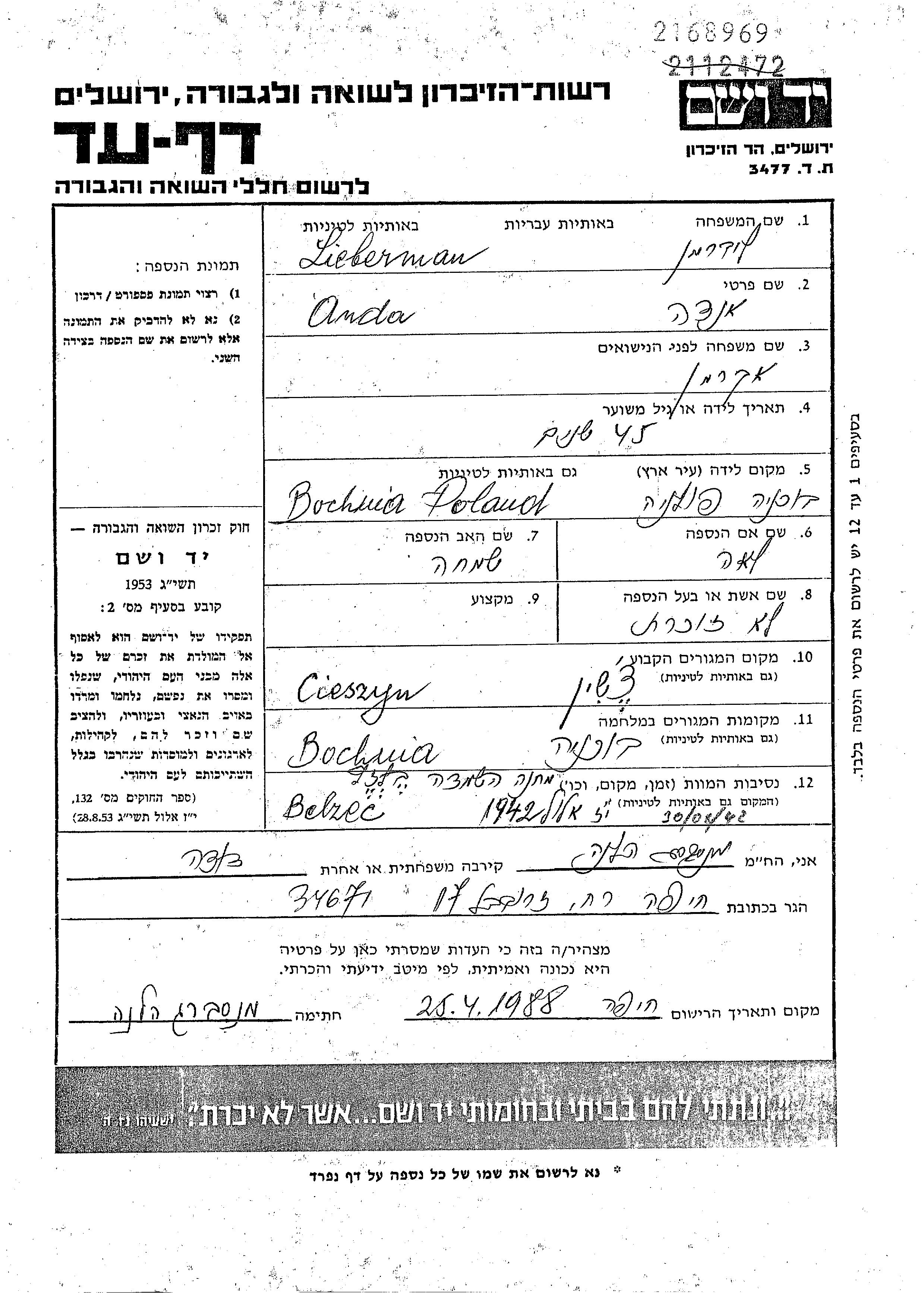 Anda Lieberman, geb. Akerman wurde im Jahr 1897 in Bochnia, Polen geboren. Sie war die Tochter von Simkha und Lea. Vor dem Zweiten Weltkrieg lebte sie in Cieszyn, Polen. Während des Krieges war sie in Bochnia, Polen.