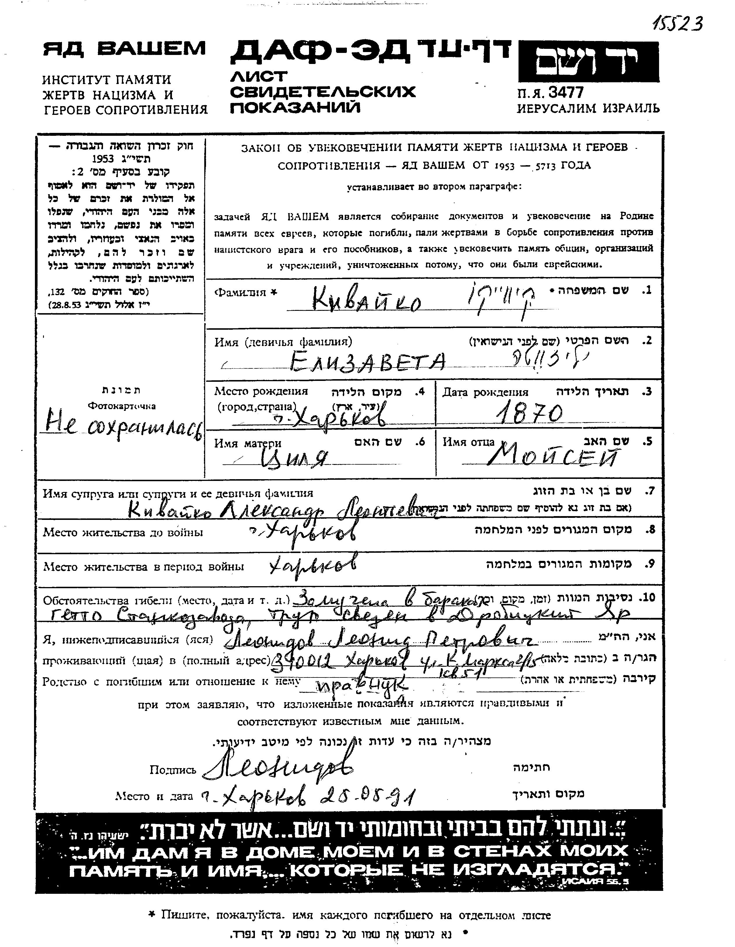 Yelizaveta Kivaiko wurde im Jahr 1870 in Kharkov, Ukraine (UdSSR) geboren. Sie war die Tochter von Moisei und Tzilia. Sie war mit Aleksandr Verheiratet. Vor dem Zweiten Weltkrieg lebte sie in Kharkov, Ukraine (UdSSR). Während des Krieges war sie in Kharkov, Ukraine (UdSSR).