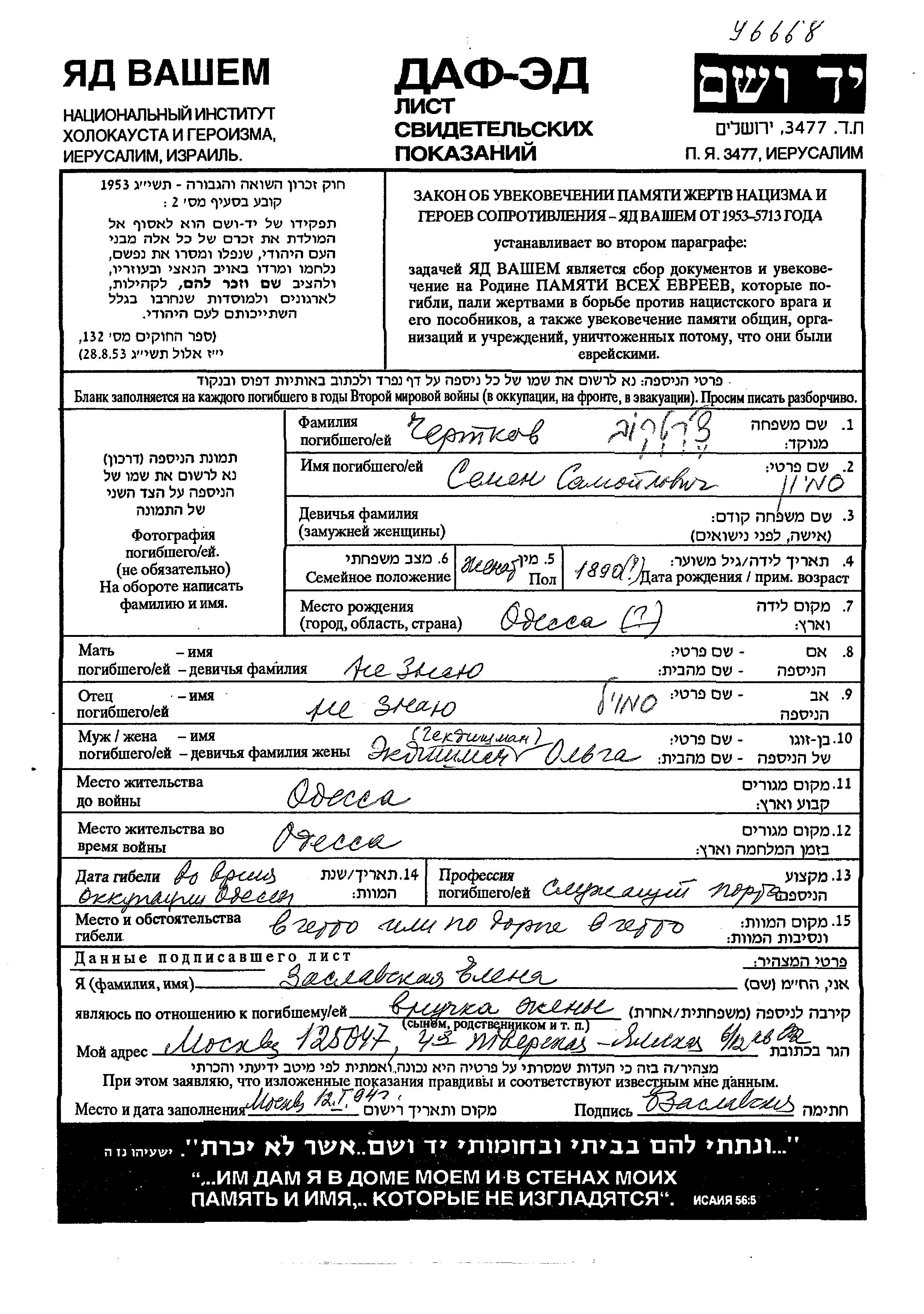 Semion wurde in der Schoah ermordet. Todesort: Odessa, Ukraine (UdSSR).