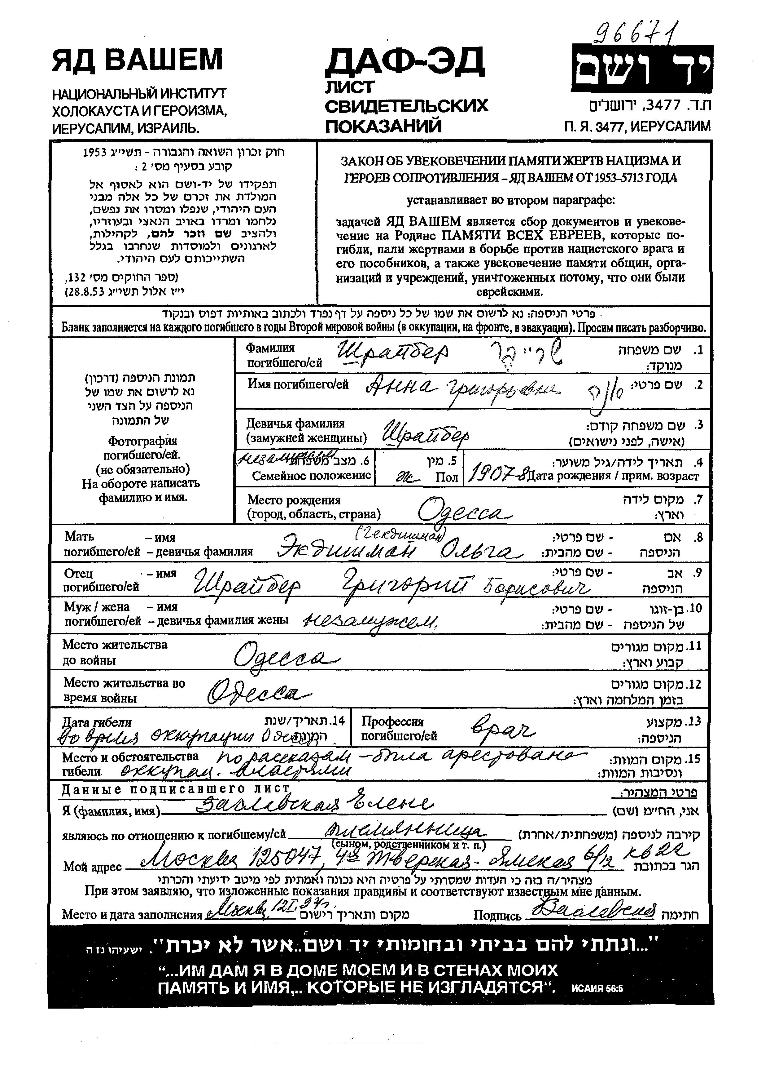 Shraiber Ana 1908 Odessa, Ukraine (UdSSR) Gedenkblatt