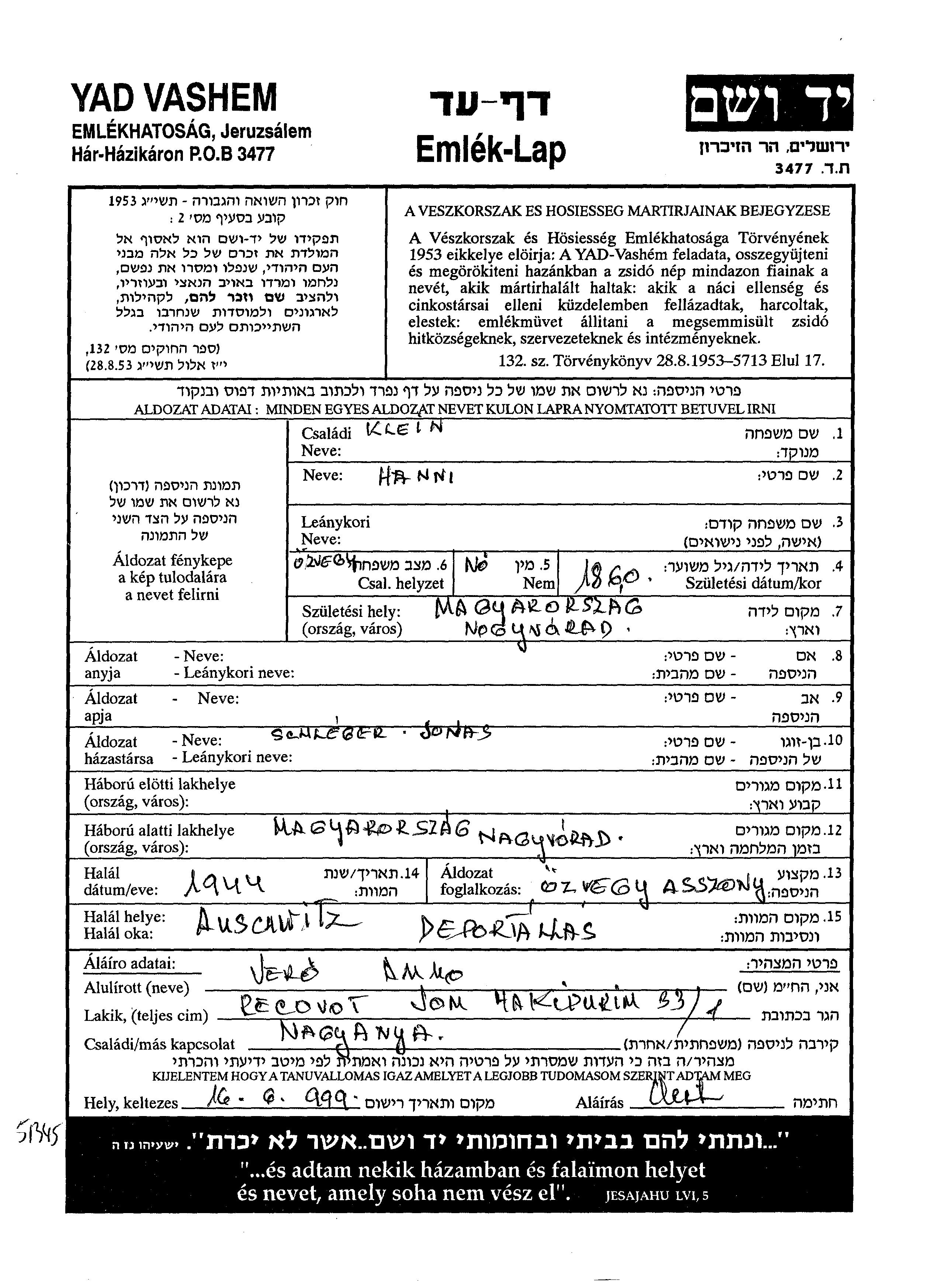 Hanni Klein wurde im Jahr 1860 in Nagyvarad, Rumänien geboren. Sie war mit Jonas, geb. Schleger Verwitwet. Vor dem Zweiten Weltkrieg lebte sie in Nagyvarad, Rumänien. Während des Krieges war sie in Nagyvarad, Rumänien.