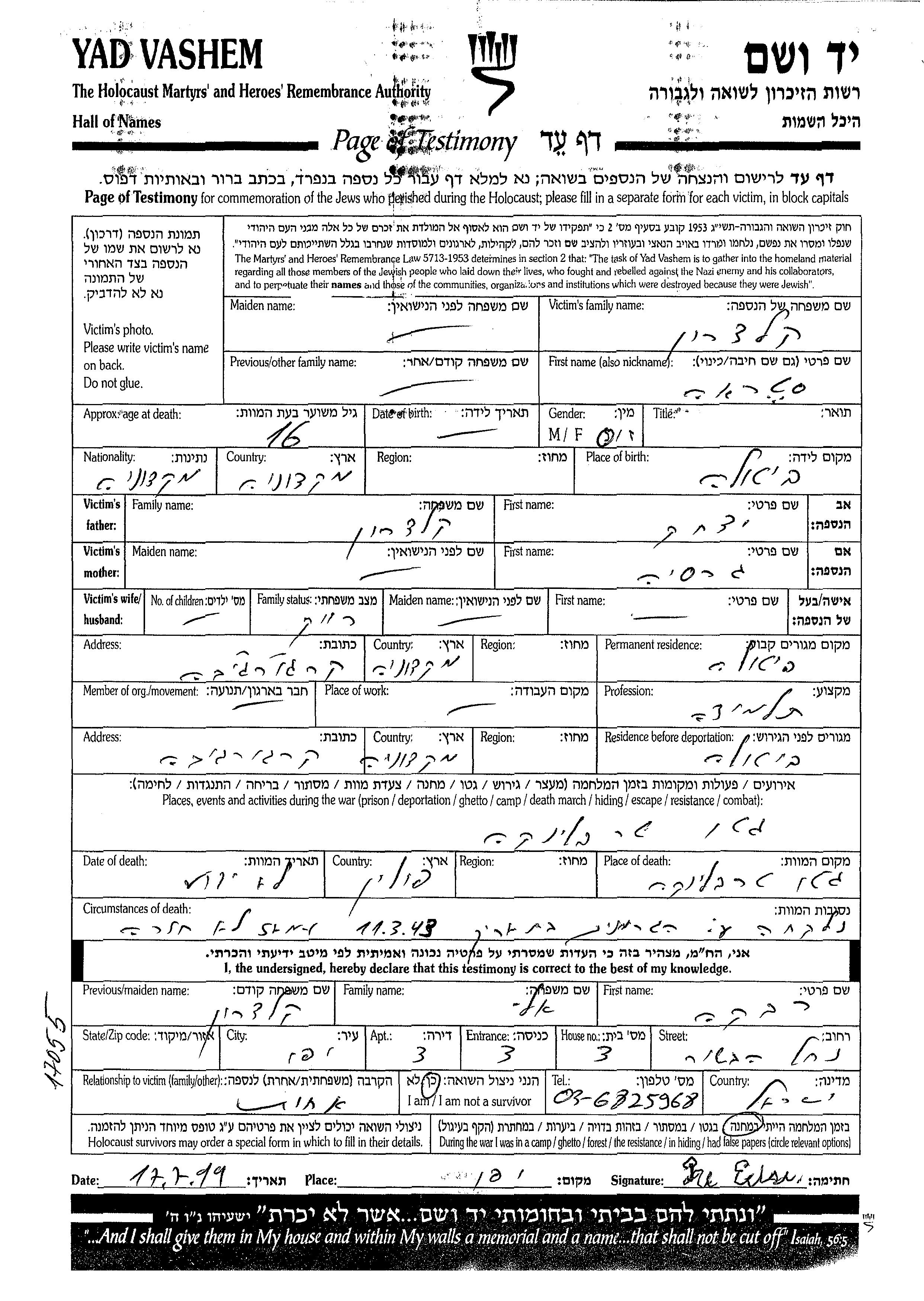 Estreia wurde in der Schoah ermordet. Todesort: Treblinka, Polen im Jahr 1943.