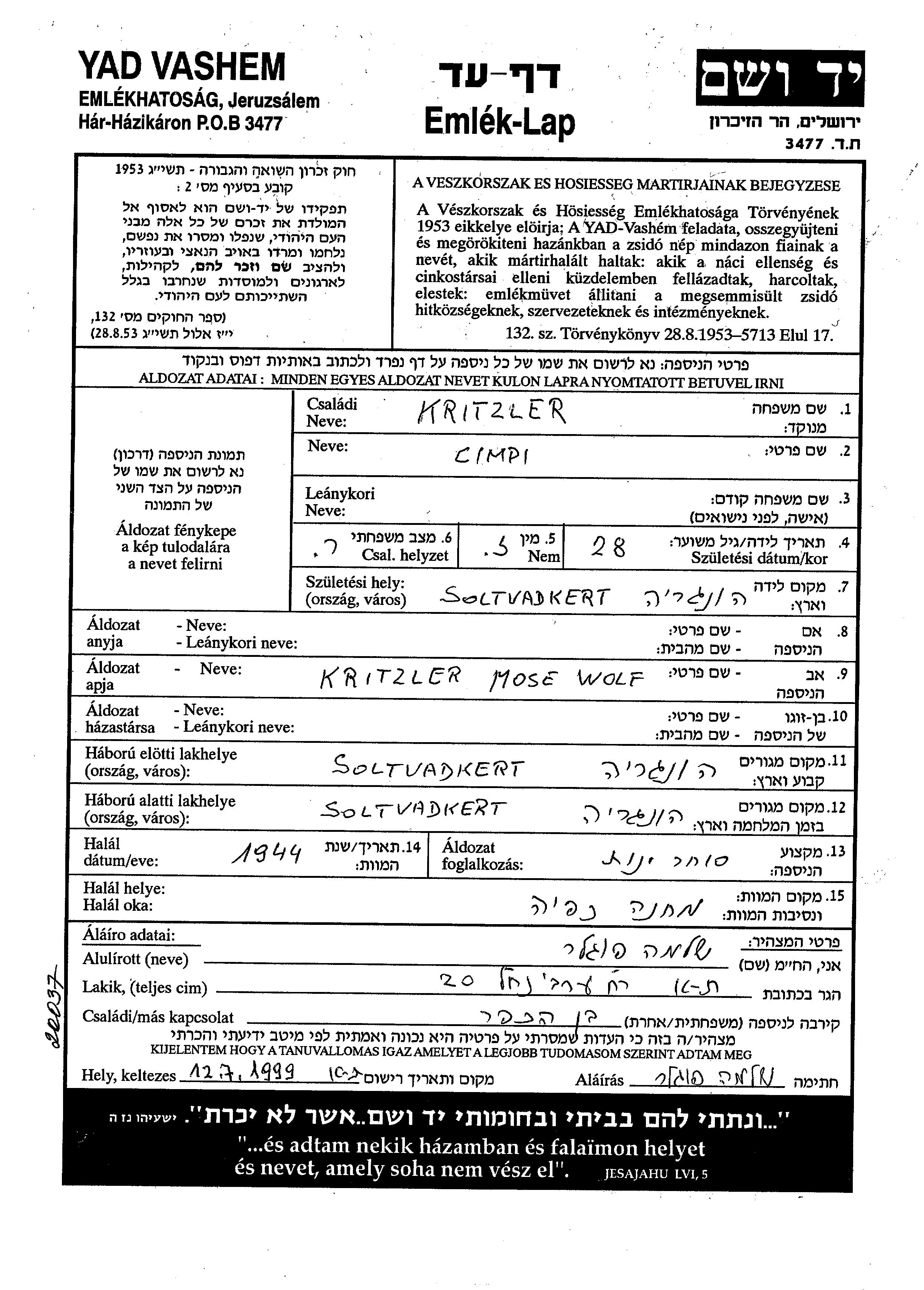Cimpi Kritzler wurde in Soltvadkert, Ungarn geboren. Er war der Sohn von Mose Wolf. Er war Weinhändler und Ledig. Vor dem Zweiten Weltkrieg lebte er in Soltvadkert, Ungarn. Während des Krieges war er in Soltvadkert, Ungarn.